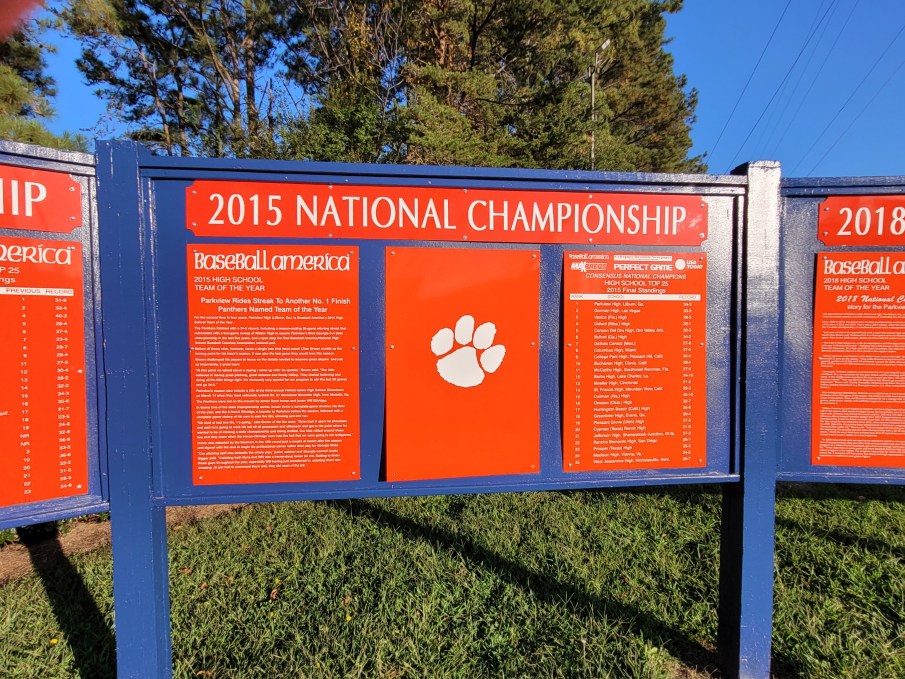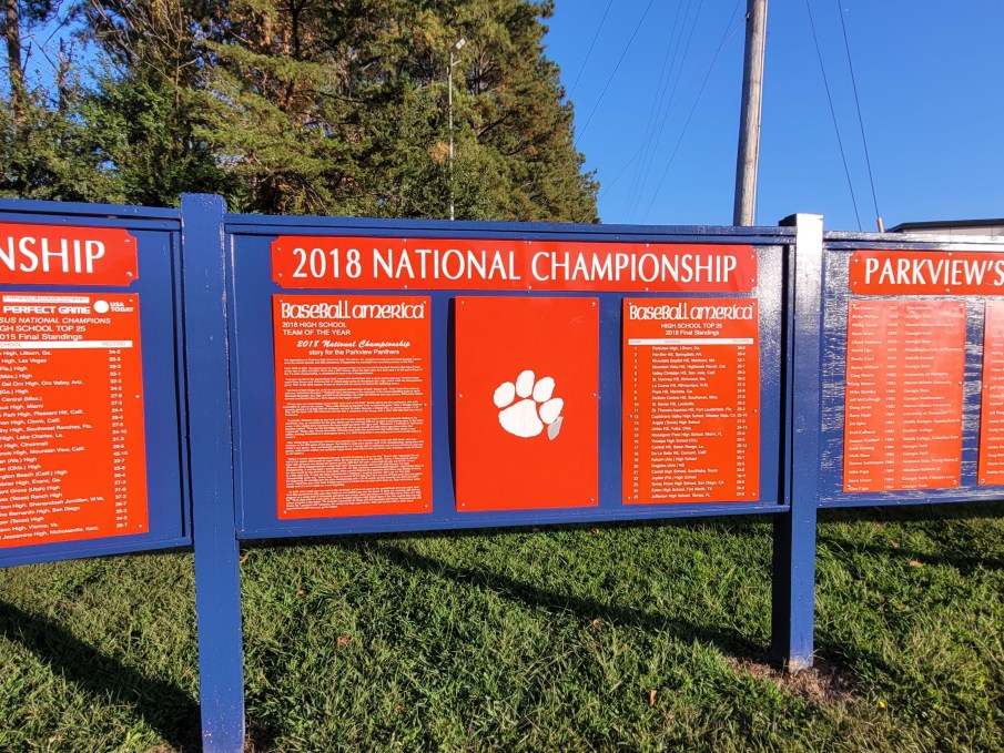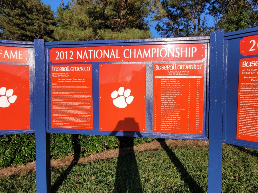 On my recent trip to Lawrenceville, Georgia for ABF Freight, I had some personal time after work to check out local baseball fields in and around the terminal. On a Google Map search of the area, I found Parkview High School in nearby Kilburn, GA as a place of interest and took the short drive from my hotel in Lawrenceville to check it out. Wow, talk about finding a diamond in the rough, or in this case a diamond filled with National Baseball Titles!!!