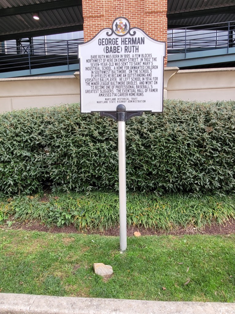It was a gorgeous weather day in Baltimore, so I wasn’t really that bummed that the stadium was locked. I took a walk around the perimeter of the stadium, down past bars and souvenir shoppes that would typically be booming during an Orioles game. And mostly likely overflowing if there was a playoff game. As I walked the perimeter, I searched the drains and bushes and parking lot areas for a stray baseball, but unfortunately I came up empty. See, I don’t always get a baseball, just most of the time. I made my way around the stadium twice before I spotted the Babe Ruth historical marker.