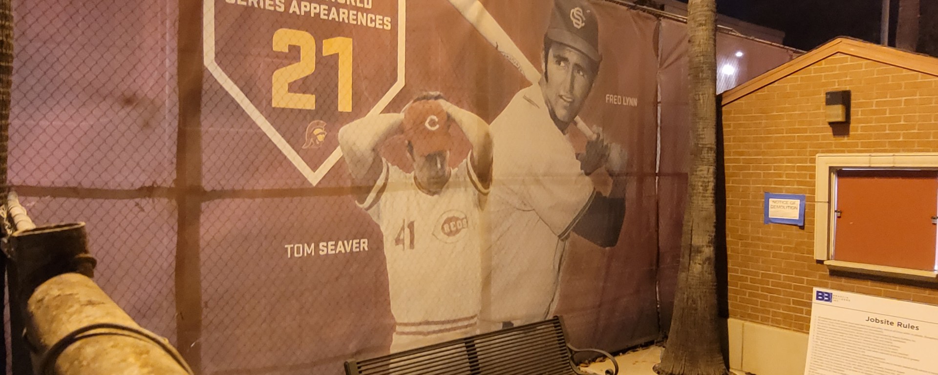 I took a chance and drove down from Whittier (where I was staying for work) down to the campus of the University of Southern California, more commonly referred to as “USC.” It was dark by the time I parked across the street from where the baseball field was situated inside the gates of USC. I took another chance and searched for a visitor’s entrance and lucky for me, found one. I walked around a huge construction site, passed the proposed site for a new football stadium, passed the tennis courts, and over to Mark McGwire Way.