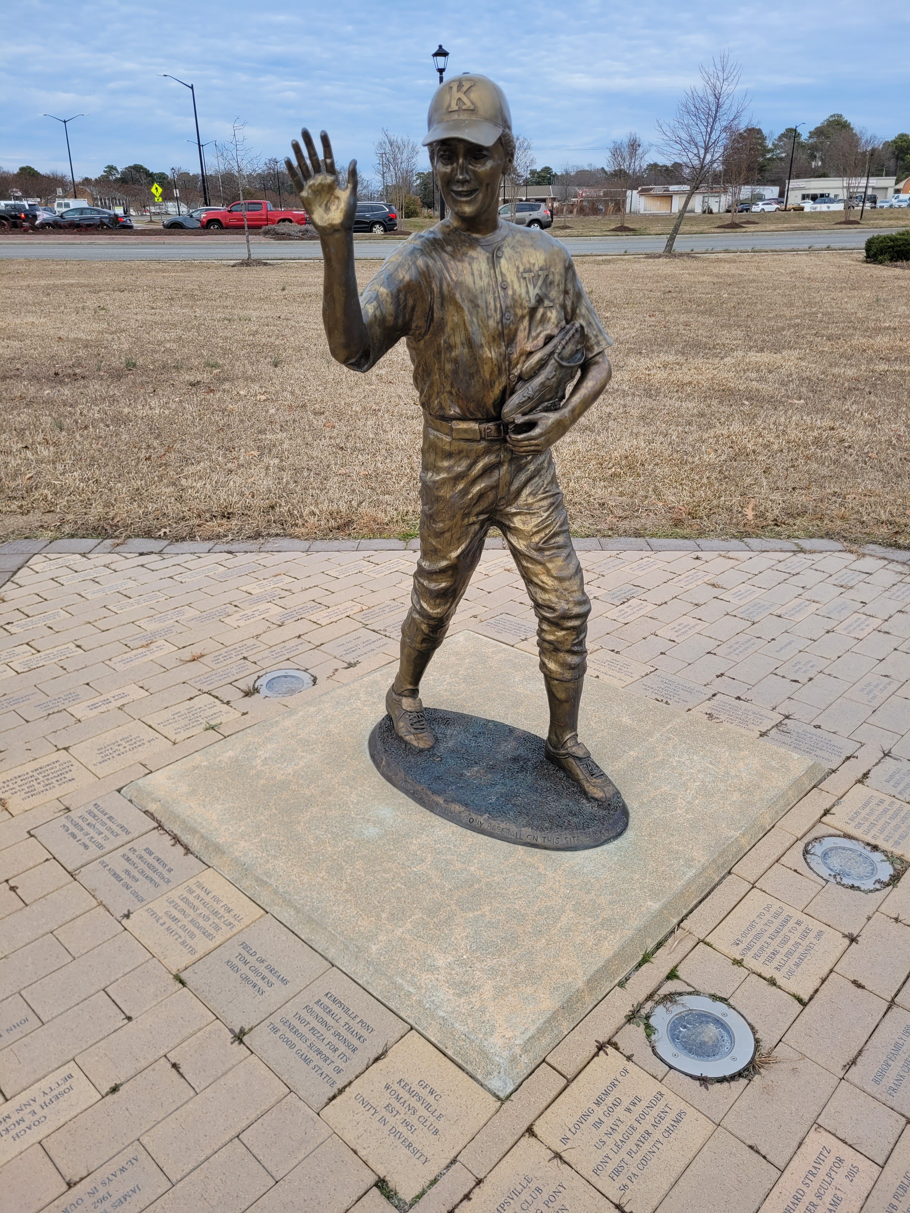 So, in the Kempsville Pony history file, the author mentions a commemorative statue and a home plate memorial located on the grounds of the former Kempsville Pony League field location. The grounds is now a beautiful park called Kempes Landing Park off Princess Anne Road/Kempsville Road. I liked the photos in the author’s history showing the baseball fields literally right up against Kempsville Road and the fact that the traffic stalled at lights was at risk of foul balls. Great visual.