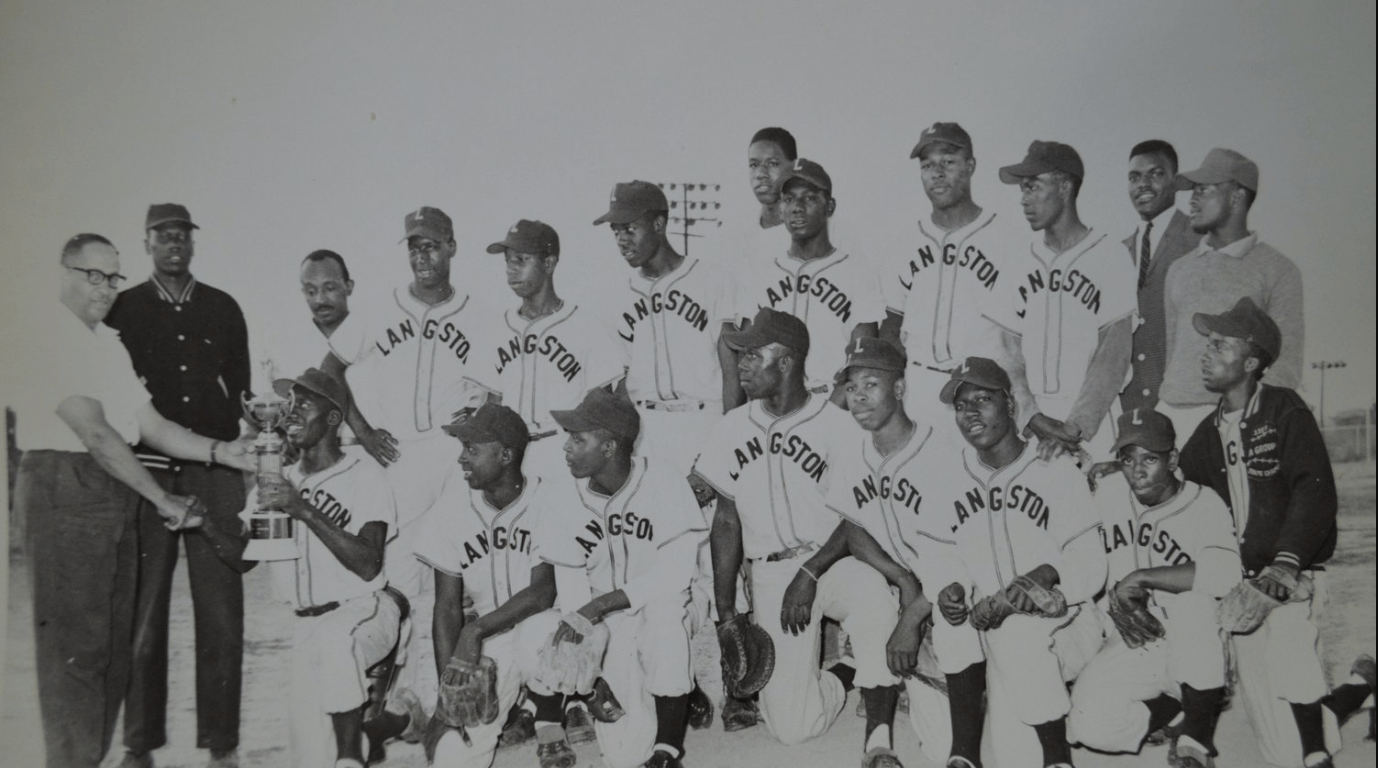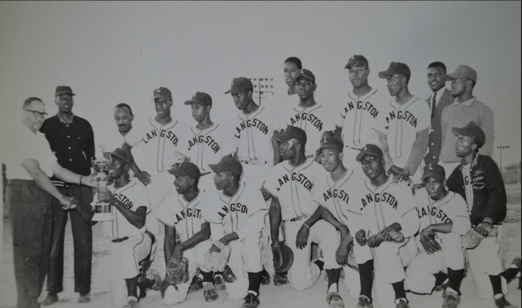 - The player kneeling on the far right has a baseball jacket which I believe has the stitching which reads “state champs, 1957.” This would mean this player was a relative, a brother perhaps, of a player on the 1957 Langston High School state championship team. I confirmed through the VIA story website that Langston did win the state title for baseball in 1957, again coached by Coach Howard Allen.