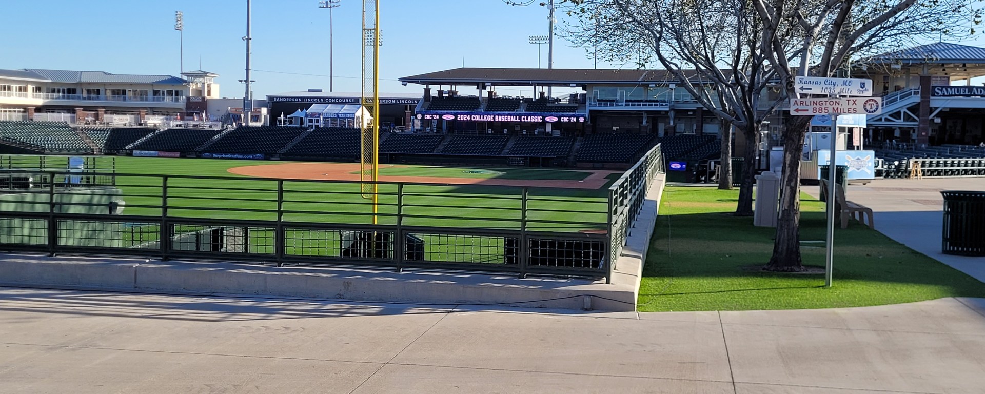 Here is one of the few decent photos I took of the stadium and baseball field. It was from the left field concession stand area on the side walk facing the visitors parking lot. Notice the two signs on the right of the photo – Kansas City, MO – 1035 miles that way and Arlington, TX – 885 miles that way also.