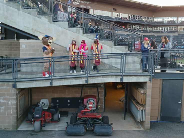 The Tacoma weather played nice on Wednesday night. Mid to upper 50s at game time, clear skies, light breeze which became a moderate breeze, mid to upper 40s by the 5th inning or so. I grabbed a hot dog and fries for dinner and sat mostly in the sun until it set behind the stadium. Then I found my way through the concession stand area back over to the lawn to watch the team mascot run through the stadium throwing hot dogs wrapped in tin foil into the stands. The fans went wild and it was hilarious to see kids fighting over hot dogs thrown up in the air.