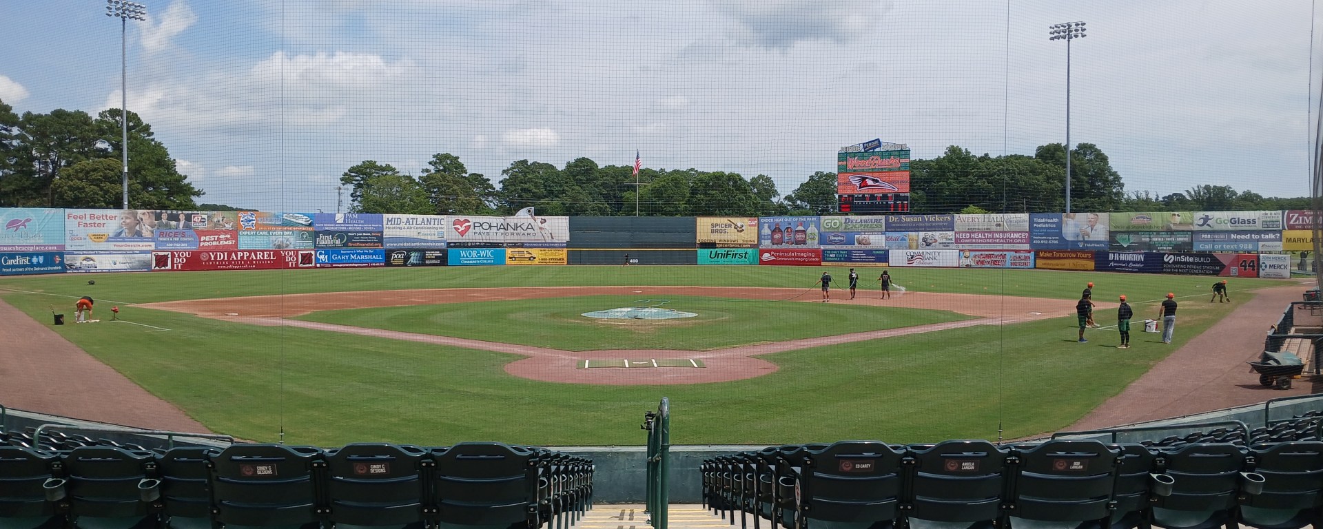 Sunday was game day for the Delmarva Shorebirds when I arrived just before 3pm. I parked in the main parking lot and found an open door to the administration office. A very nice receptionist greeted me and nodded enthusiastically “yes” when I asked if I could take a photo or two of the field. After entering the stadium, I was greeted by several other friend Shorebirds staffers who invited me to walk around the field, check out the boardwalk in the outfield area, and to come back again for a game. Vendors were making their final inventory arrangements. Players were stretching and doing pre-game exercises on the field and in the bullpens. Staff were cleaning countertops and other fan locations. It was a very warm and welcoming atmosphere from the receptionist to the game day staff, and I just loved that feeling.