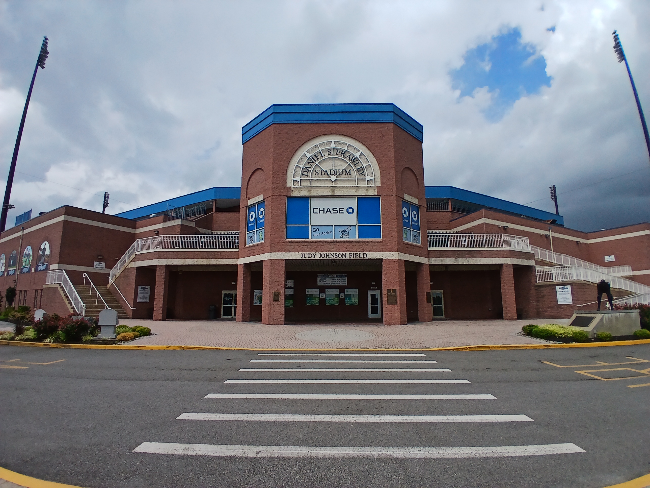 Shortly after parking and seeing gates closed, ticket offices not lit up, and no sign of any Blue Rocks staff, I realized my only tour would be a self-guided tour of the perimeter of the stadium. But here is what I did find and learn about and photograph. First off, the Wilmington Blue Rocks gets its name from the blue granite rocks, which can be found along Delaware’s Brandywine River, according to the Wikipedia page for the Wilmington Blue Rocks. Officially, the Blue Rocks play at Judy Johnson Field at Frawley Stadium. Both Frawley and Johnson have commemorative plaques outside the baseball park. The stadium sits next to the Delaware Sports Museum and Hall of Fame and just blocks from the riverfront of Wilmington. The Blue Rocks are the Single A affiliate of the Washington Nationals. They have called Wilmington, Delaware home since 1993.