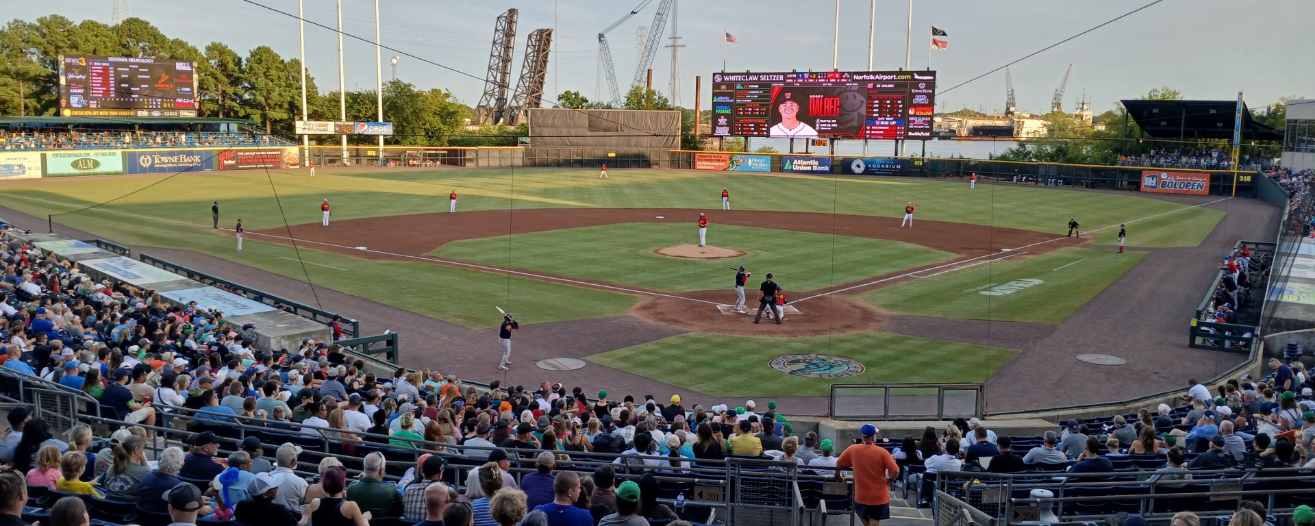 It was a beautiful night for baseball at Harbor Park, home of the Norfolk Tides. Humidity, gone. 70 degree temps, light breeze, clear skies – check. Sweatshirt weather, eh not yet. Harbor Park is situated right on the water, boats sailing in and out of the harbor, planes getting ready to land at nearby Norfolk Airport, the military ships and shipping agencies fill up the background of the park along the waterfront, very easy to get to, and for the most part, easy to park and walk to the stadium. Last night, the traffic did back up a bit getting to the park but I (and Rachel) eventually snuck my way into a tiny spot in a lot across from the main parking lot area. $6 to park, not bad. Not bad at all. Thank you nice parking lot attendant for accommodating us! We missed the first inning of the game, but no worries. It happens. They still play 9.