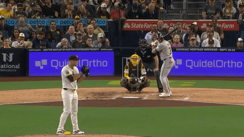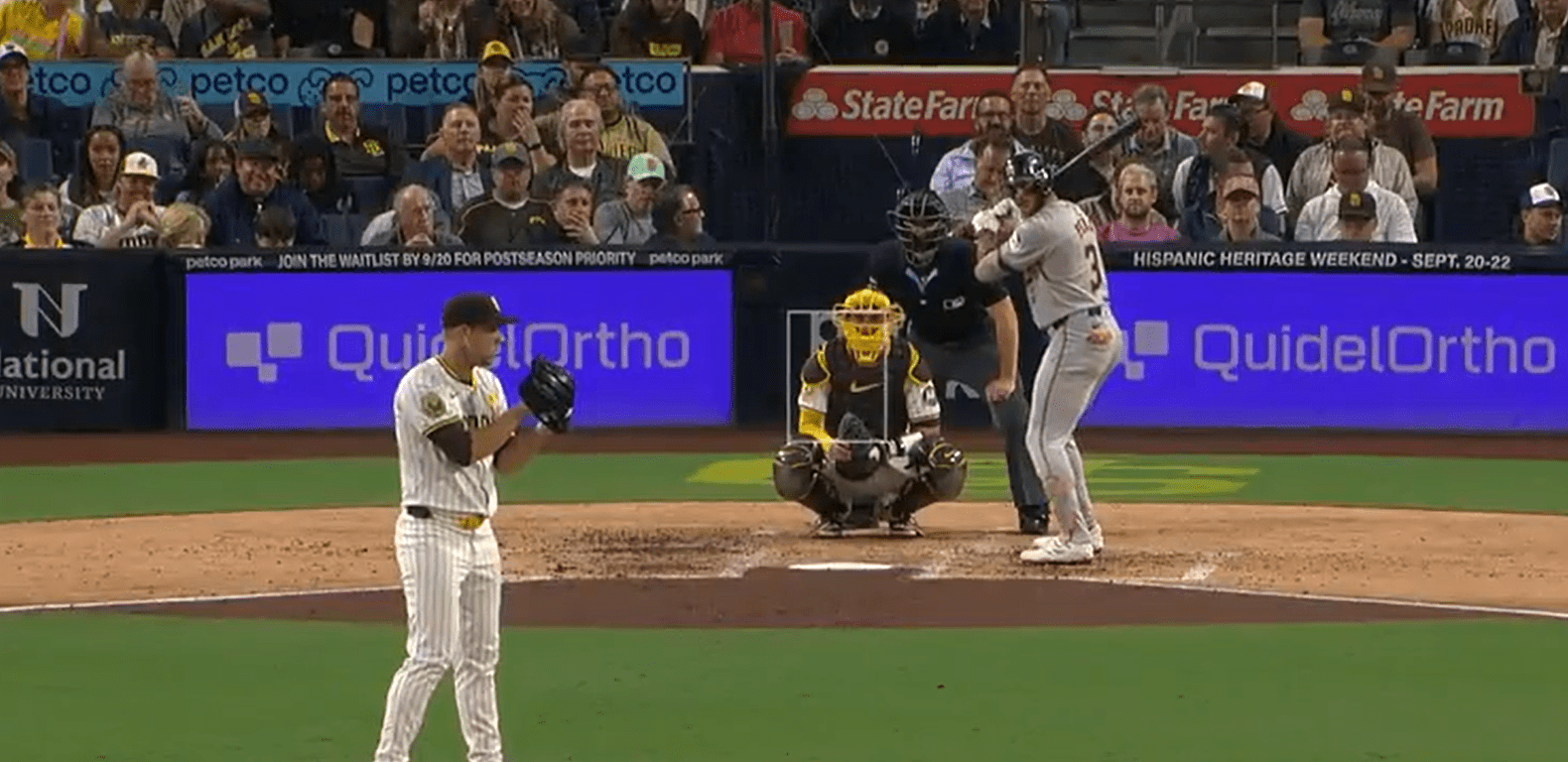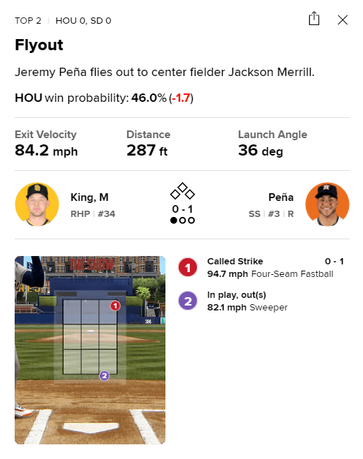 Their first matchup was in the Top of the 2nd inning. Michael King, wearing the Padres #34 got Jeremy Peña, wearing the Astros #3, to flyout to centerfield. 82 mph sweeper, here’s the snip from the MLB recap: