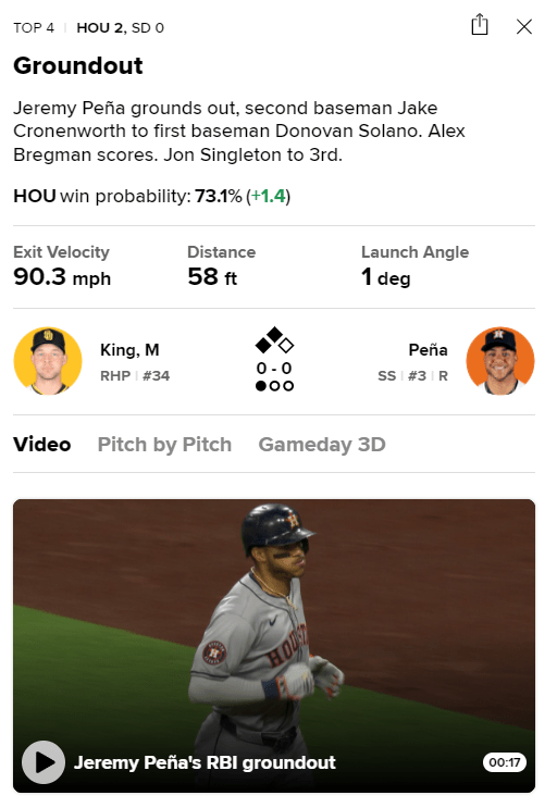 Next at bat, King was in a bit of trouble, having giving up a few hits and an “excuse me” double to put runners on 2nd and 3rd with less than 2 outs. Peña came up to the plate and immediately punched a ground ball to the right side of the infield, scoring Alex Bregman. RBI – Peña.