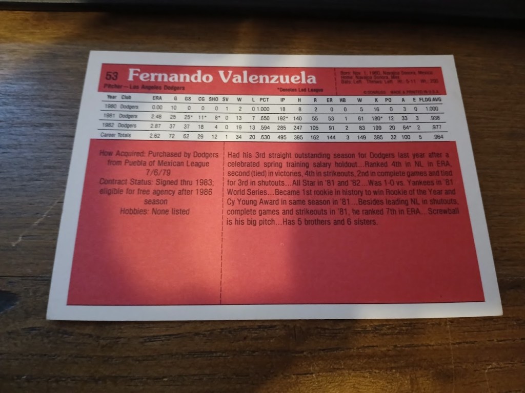 I found another card produced by Donruss which has an awesome photo of Valenzuela in full stride on the mound. On the back of this 1983 baseball card are Fernando’s stats from 1980 to 1982. I didn’t know that Valenzuela actually came up and pitched in 1980, prior to his historic Rookie of the Year/Cy Young campaign in 1981. Valenzuela appeared in 10 games, did not give up an earned run, had 1 save, 2 wins, and struck out 16 batters. Wow, in 1980 he was just 19 years old. What a player, just incredible stats! Here is that card so you can enjoy the stats, the information, the way we used to get our baseball knowledge before the internet.