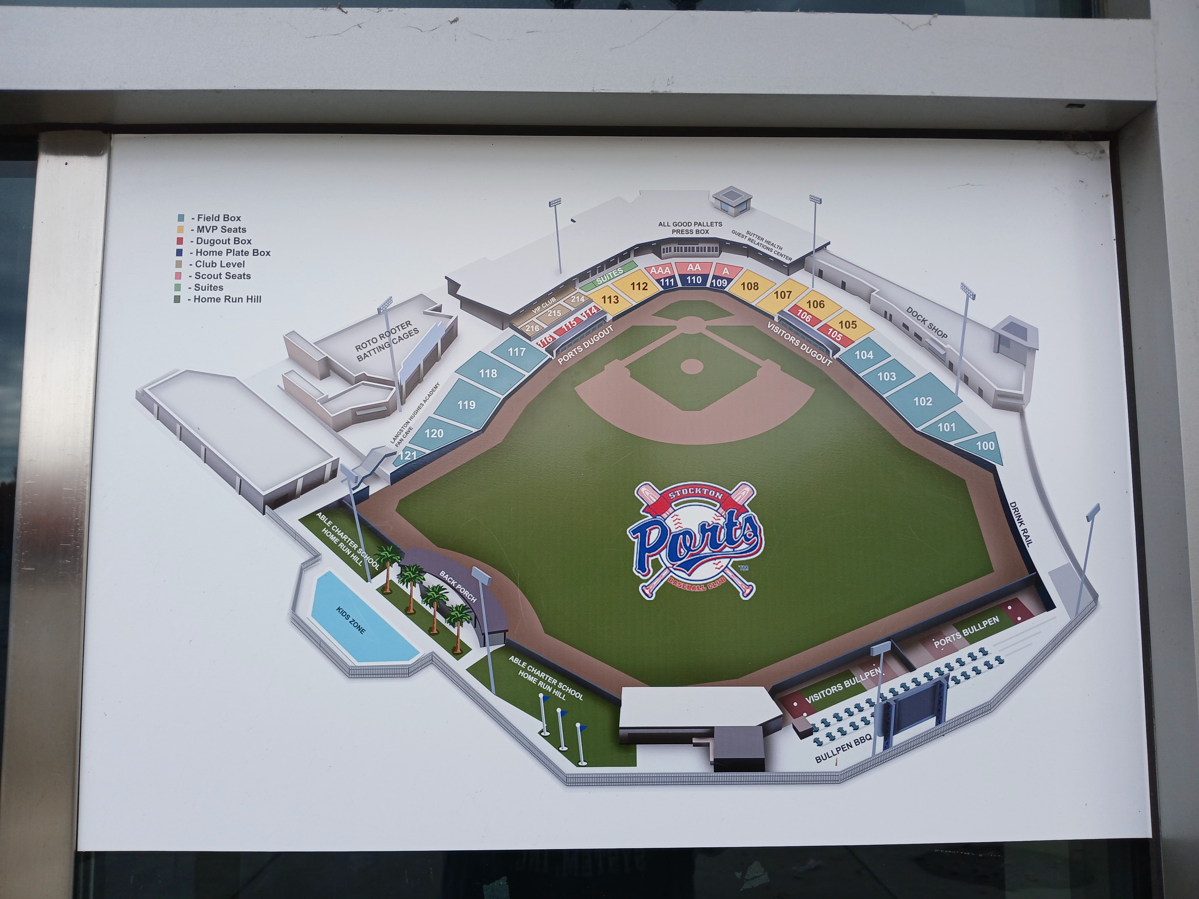 Last week, I was back on the West Coast for a business trip (ABF Freight) to Sacramento, CA. During the late mornings/early afternoons, I found some personal time to check out some baseball fields. Having already visited Sacramento’s Sutter Health Park, I decided to head south to Stockton to check out Banner Island Ballpark, home of the Stockton Ports.
