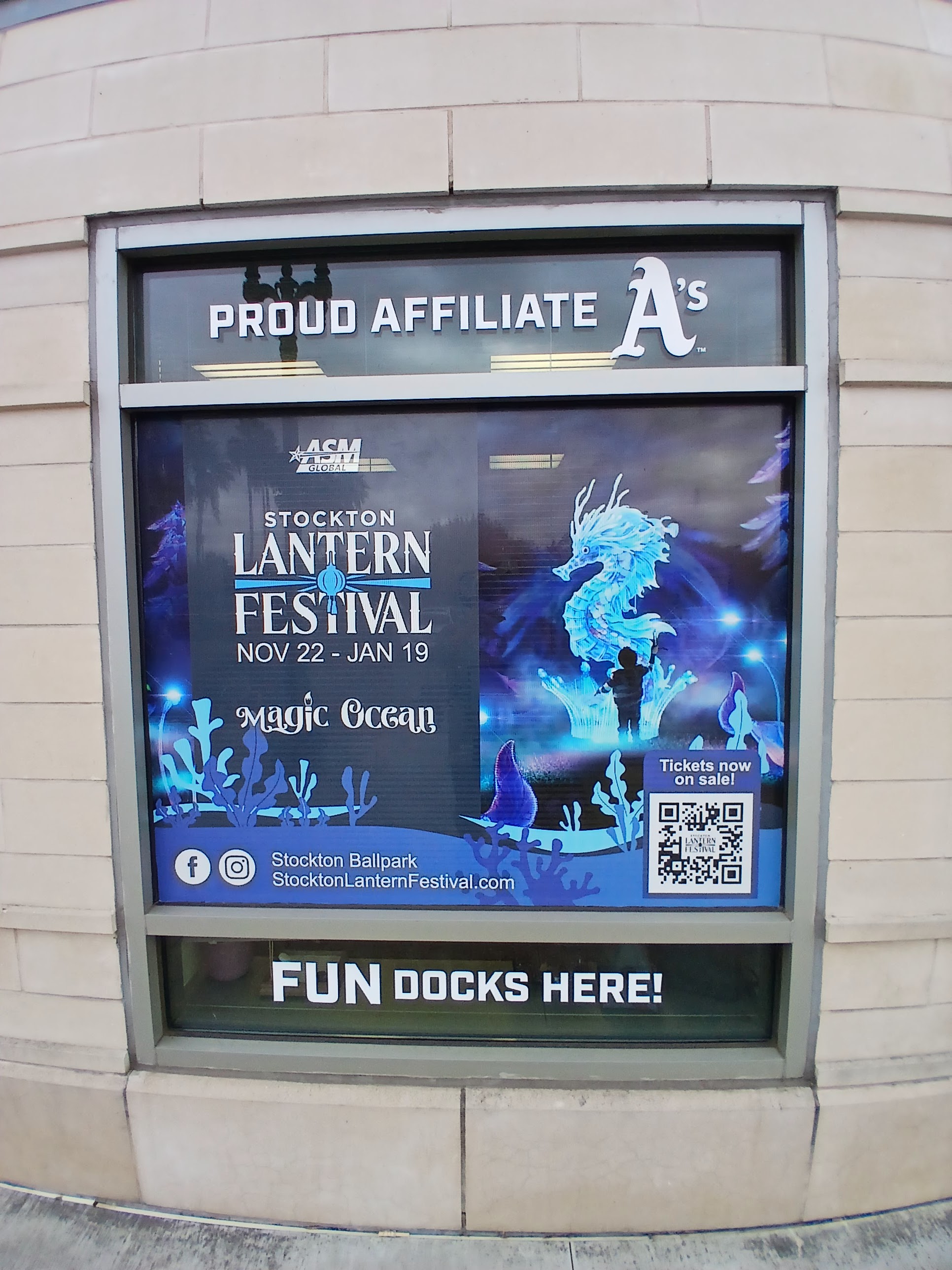 As I approached the front gate, I realized I was in fact at the right place. Banner Island Ballpark, home of The Stockton Ports, the Single A Affiliate of the (then Oakland) Athletics, had been transformed into an amazing array of lanterns for the Stockton Lantern Festival. It’s theme, “Magic Ocean,” was set to run from November 22nd through January 19th. Just the right amount of time to multi-purpose the field and then get it ready for Spring baseball for the Ports. Great idea. Here was a poster promoting the event near the ticket office.