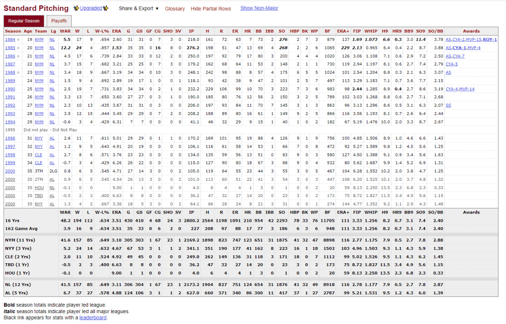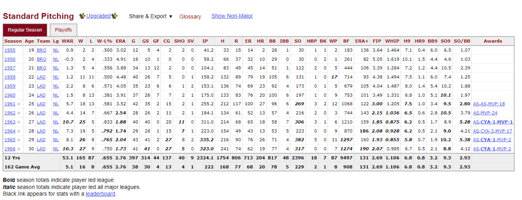 Oh, you’d like some comparisons? Sure, let’s start with the book’s subject I am currently reading – Sandy Koufax. Let’s hop over to the old reliable Baseball Reference website for some numbers. Well, look at that, Koufax made his debut at 19, just like Doc. Stats – 165 wins, 87 losses for Koufax. Gooden – 194 wins, 112 losses. How about the stats I love – 162 game averages. Koufax – 16 wins, 8 losses, 222 innings pitched, 229 strikeouts, 78 walks, 2.76 ERA. The stuff of legends and by all accounts, Koufax may be the greatest pitcher for the time he pitched of all time. Now Gooden’s 162 average – 16 wins, 9 losses, 227 innings pitched, 186 strikeouts, 77 walks, 3.51 ERA. Koufax pitched for 12 seasons, Gooden for 16 – I am just wondering what Gooden’s 162 average was for his first 12 years as a comparison. I bet it was as good or better than Koufax’s!!! Here are the two legend’s stats for your viewing pleasure, courtesy of Baseball Reference.