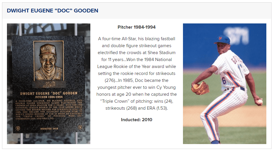 In 2010, Dwight Gooden was inducted in the New York Mets Baseball Hall of Fame. Certainly, a wonderful honor for a NY Met star that brought a ton of fans to Shea every fourth or fifth day to see Doc dismantle National League hitters. Here is his tribute post courtesy of the NY Mets Hall of Fame page: