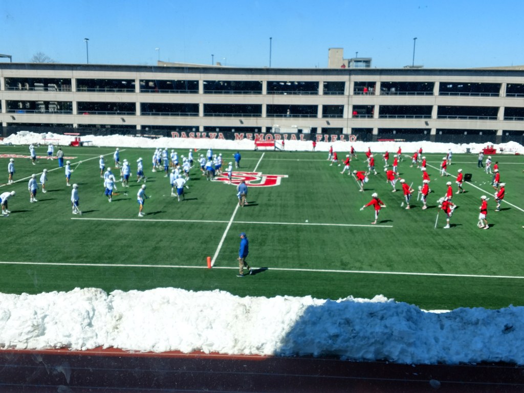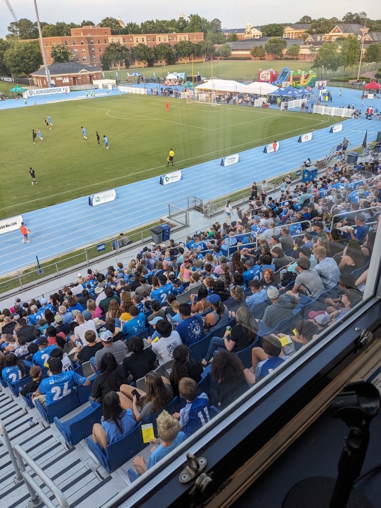 Perry – For most PA announcing jobs you work solo. The only two sports I ask to have someone with me is a spotter for Football and Soccer. A spotter is someone who is watching the game with binoculars and can call out the numbers of the players during plays so I can announce them in a timely manner. And if anything is on television, usually a producer is sitting with me counting me in after commercials or when the game is going to commercials so I can time my script reads correctly.