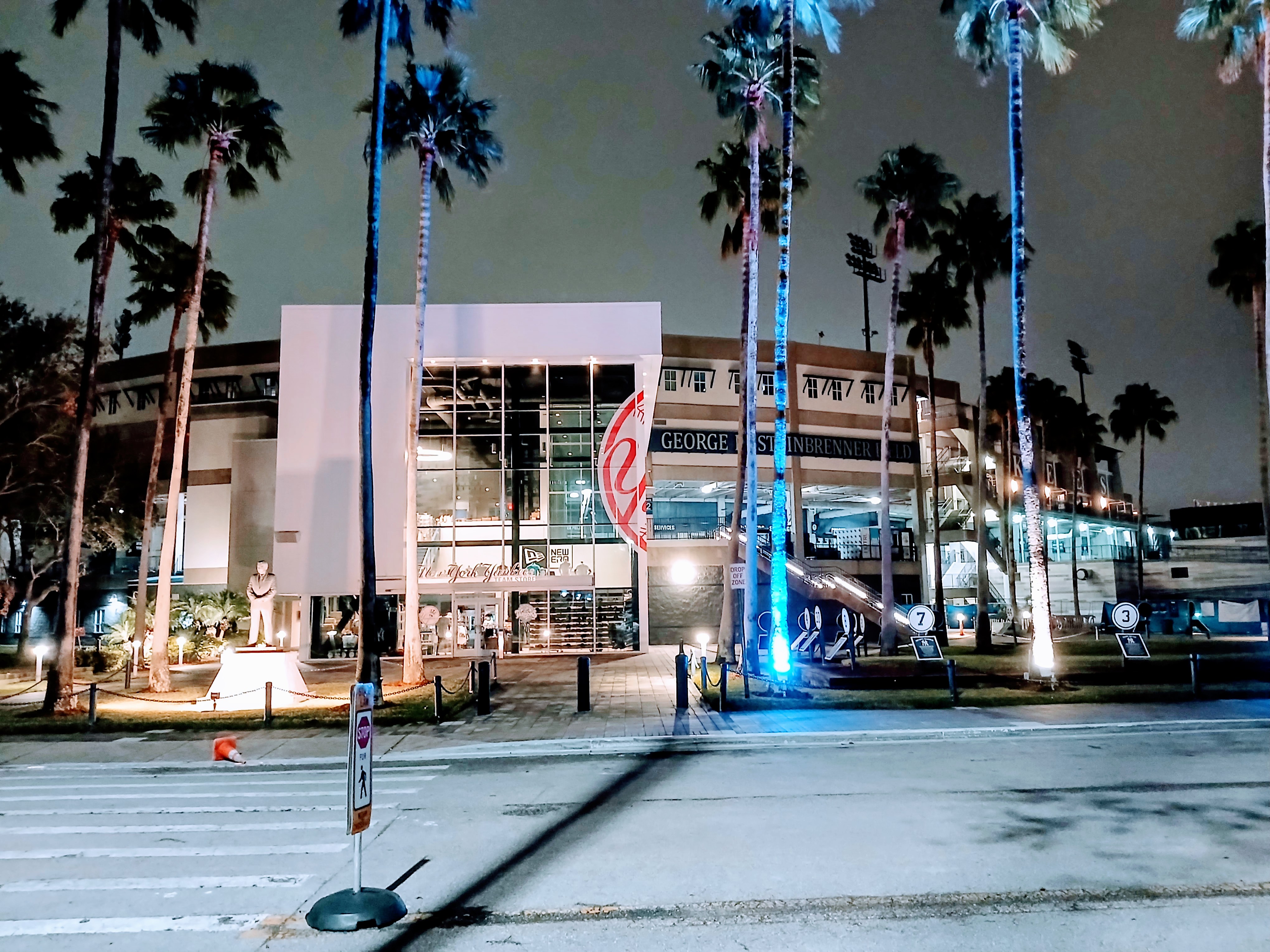 First thing that caught my attention – the George Steinbrenner statue, lit up in the early morning darkness, just in case a baseball fan like myself wanted to read more about GMS and his volume of work with the NY Yankees. Actually, first impressions – the front of the stadium looked amazing with the palm trees rising high up, a plethora of NY Yankee tributes illuminated throughout the front gate area, and a clean, professional look to the baseball field entrance. Steinbrenner, the owner who disapproved of beards and crazy hair and overall untidiness would have been proud of what I saw on Tuesday am.