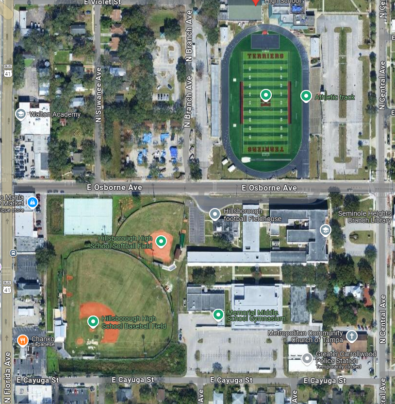 I was in Tampa, FL last week for ABF Freight and took the very short drive from my work location over to Hillsborough High School. Due to classes being in session and the fences secured/locked, I didn’t get a chance to go onto the field or even explore any of the grounds. I parked in an adjacent parking lot behind the field and school and took a few photos. Not complaining, I was just psyched I had the opportunity to check it out.
