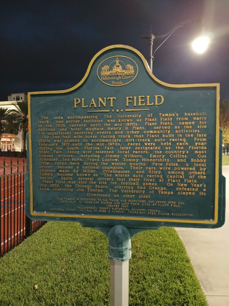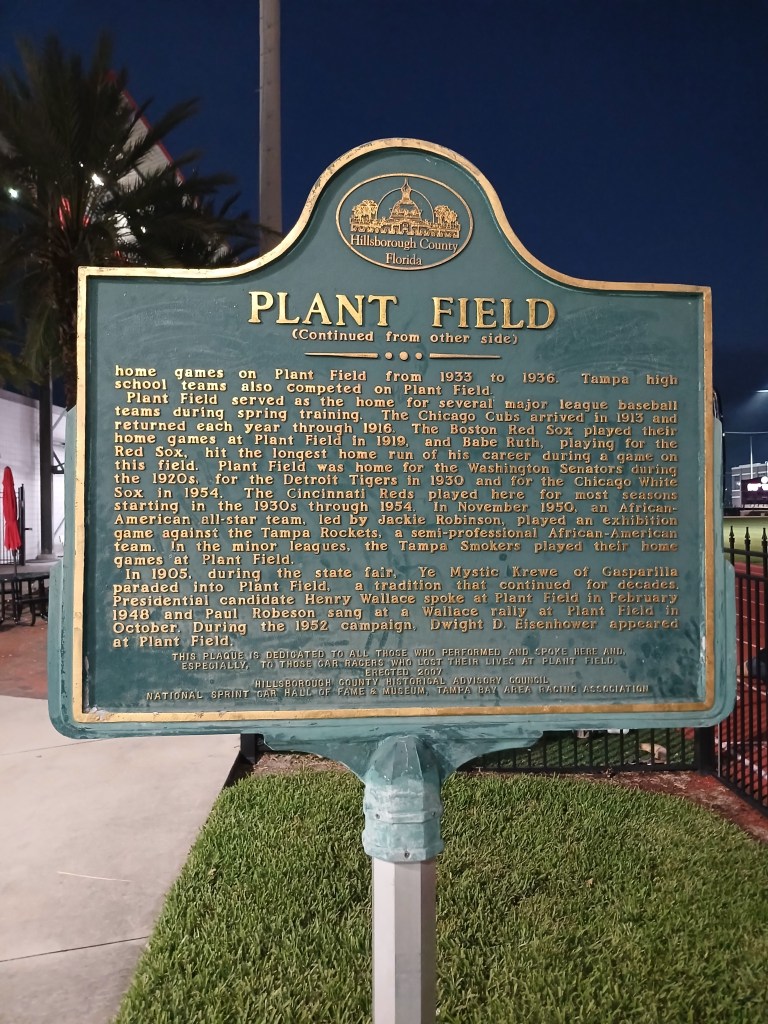 To paraphrase, the area where the baseball field, soccer field, and running track currently occupy was once known as Plant Field. Plant Field once hosted the Florida State Fair, automobile races, football games, and was the Spring Training home for several Major League baseball clubs like the Chicago Cubs and the Boston Red Sox. Pretty cool find on my way to a very well lit up baseball stadium that was filled with youth baseball players, playing outside.