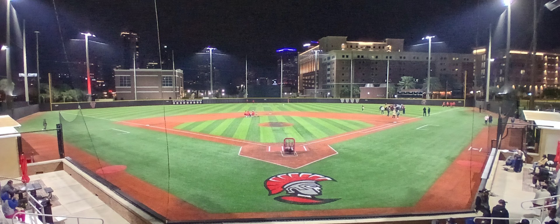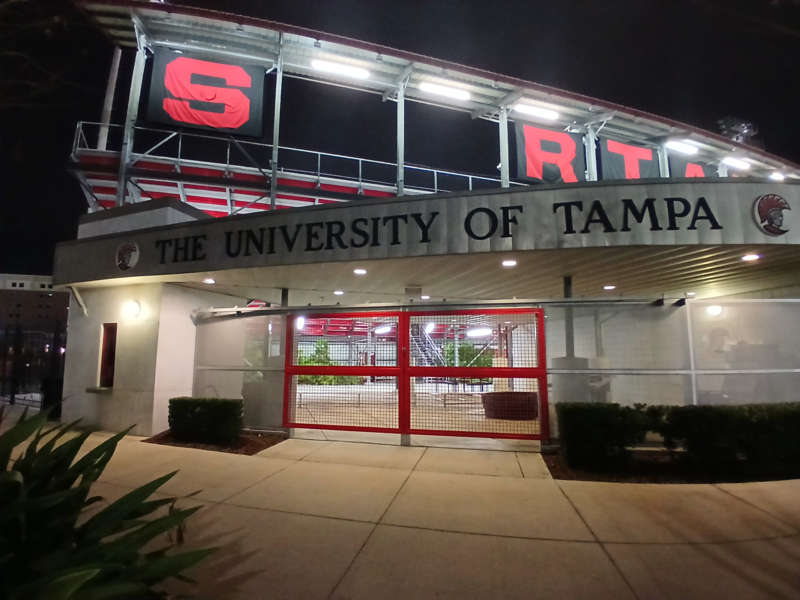 One recurring theme I had exploring baseball experiences in Tampa last week was they were all night time visits. My work commitments were from early morning to late afternoon, so sunlight just wasn’t going to factor into my baseball explorations in Tampa. Not to worry, I actually got really lucky with stadiums and ballparks being open and lit up. Case in point, my trip to the University of Tampa just after dinner time last Thursday night.