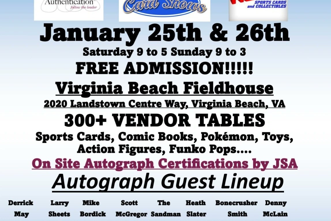 This past week, I connected with 757 Card Shows Co-Promoter Russell Savage about his upcoming sports card and collectibles expo. The expo is scheduled to place all weekend, Saturday and Sunday (January 25th and 26th) at the Virginia Beach Fieldhouse. Saturday, doors are open 9am to 5pm. Sunday, expo hours are 9am to 3pm. Free admission both days. Here is a flyer I snipped from the 757 Card Shows’ X page: