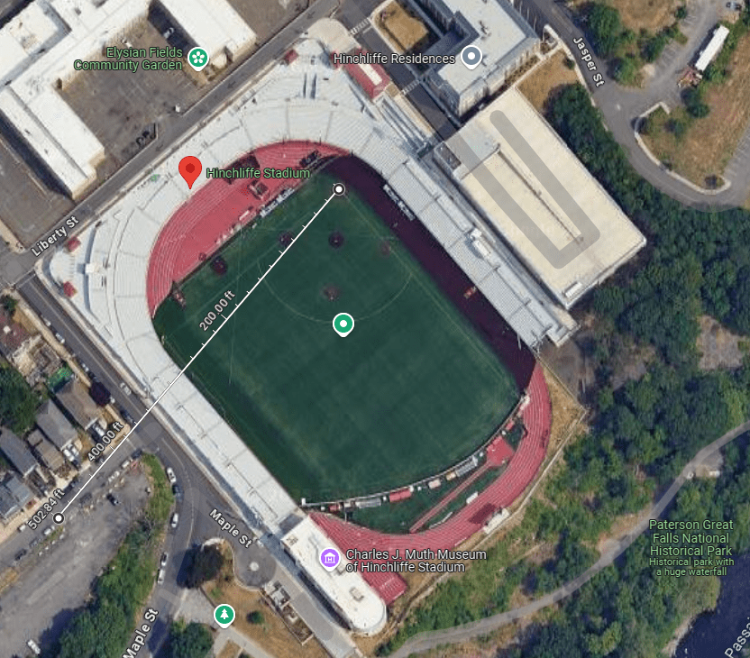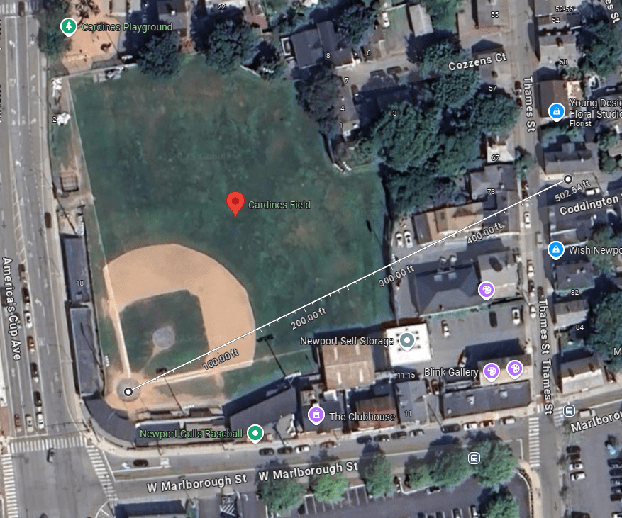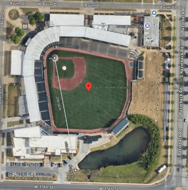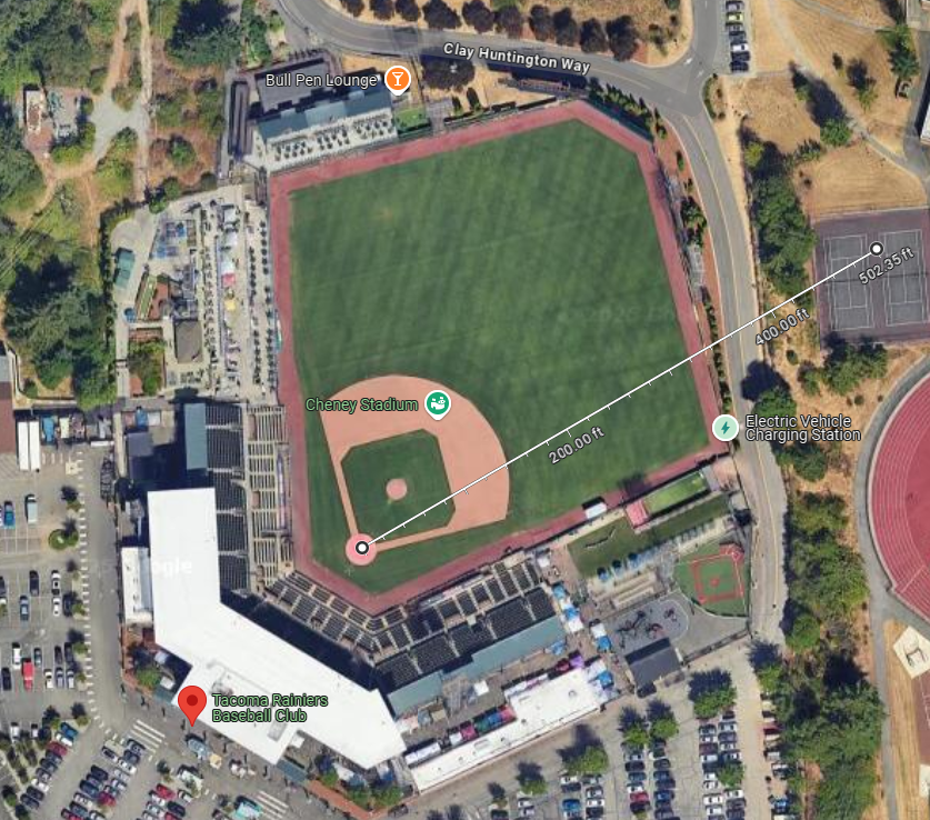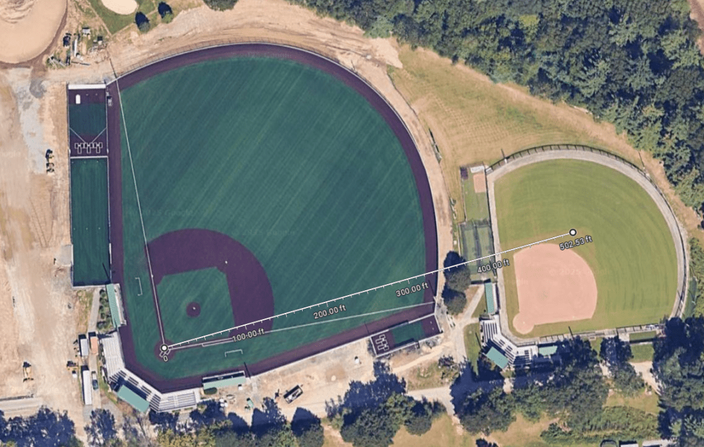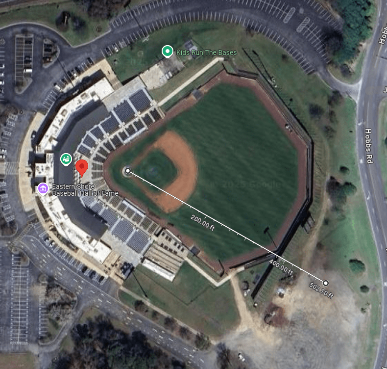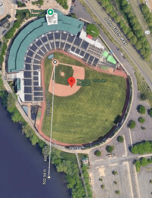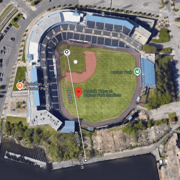After reading the refresher article and clicking on a few of the hyperlinks in the article, I was thinking about that mammoth home run. And where it would land in other ballparks, approximately speaking. So, I took to Google Maps and drew out 502 feet of distance to roughly right field or thereabouts. And here are ten of the hundreds of ballparks I have visited in the last 15 years, showing the 502 foot distance measured and where Ted Williams’ home run would have landed had it been hit in that ballpark.
