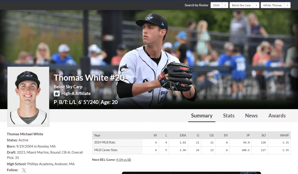 Thomas White was the best pitcher in New England, college or pros, for nearly his entire high school career in Massachusetts. Pitching for Phillips Academy, White made headlines from his first pitch to the last one he threw before starting his professional baseball career at the young age of 18. White was tall, threw hard, threw with command, had struck out numbers that were videogame like, and was an early commit to coveted Vanderbilt University on a full baseball scholarship. White was almost more fictitious than real sometimes, his stats were so gaudy, they didn’t seem real. According to his stats online, White finished his Junior year at Phillips going 6-1 with an ERA of 0.61. His senior year, White backed up his prospect status and went 5-2 with a 1.66 ERA and recorded 95 strikeouts in just about 42 innings pitched. White won Massachusetts Gatorade Player of the Year for his Junior and Senior Years. As stated earlier, White was a 1st Round draft pick, the 34th player selected overall, by the Miami Marlins.