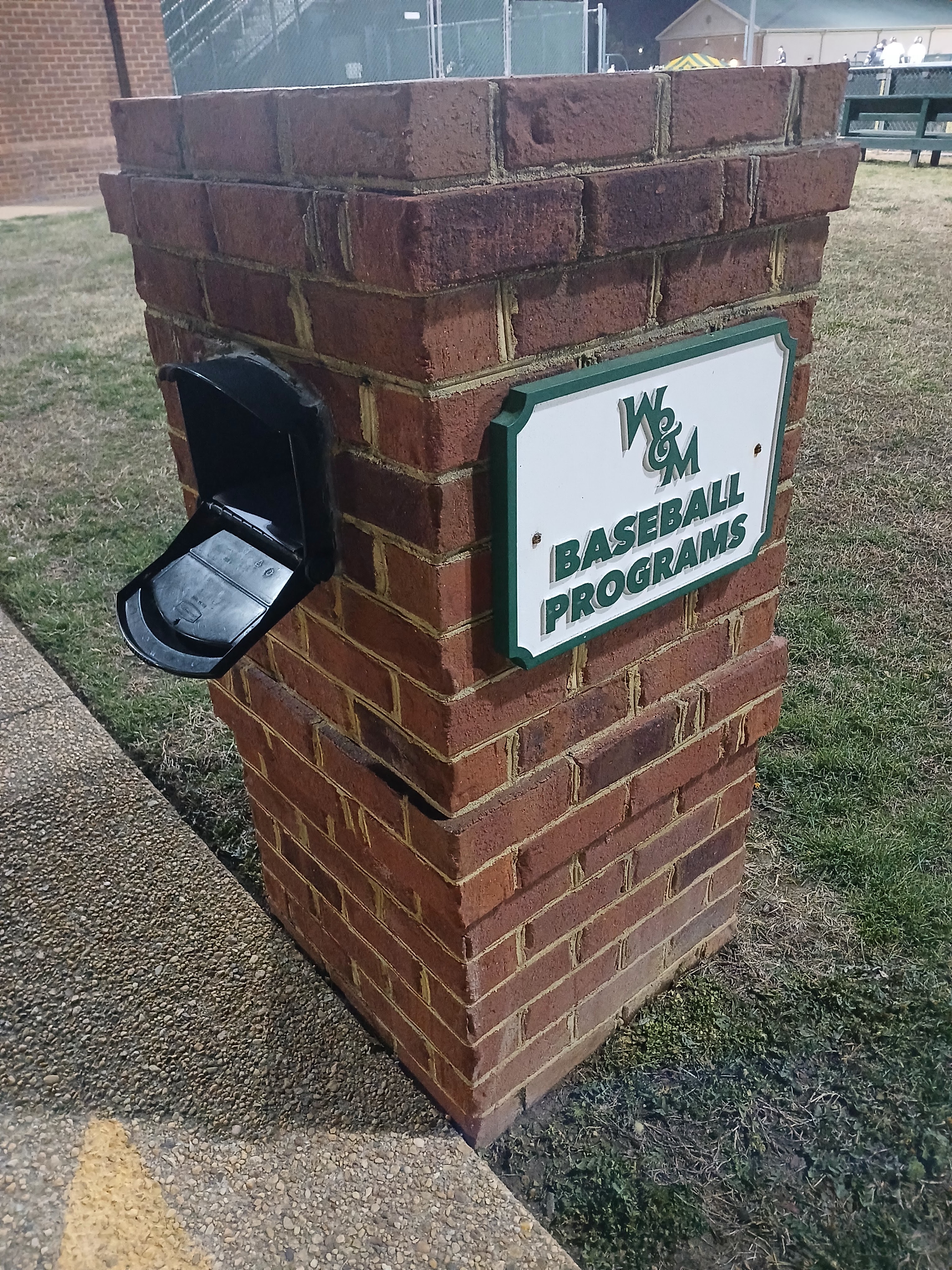 So, after a leisurely walk around Colonial Williamsburg yesterday (pre-game), Rachel and I made it over to Plumeri Park about 25 minutes before game time, 6pm. After getting our GA (General Admission) tickets, I popped over to the concession stand for a hot dog special, then back to the program distribution center, aka a mailbox built into a brick rectangle. Don’t you just love the simple things in life, like opening up a mailbox and grabbing a program for a baseball game???