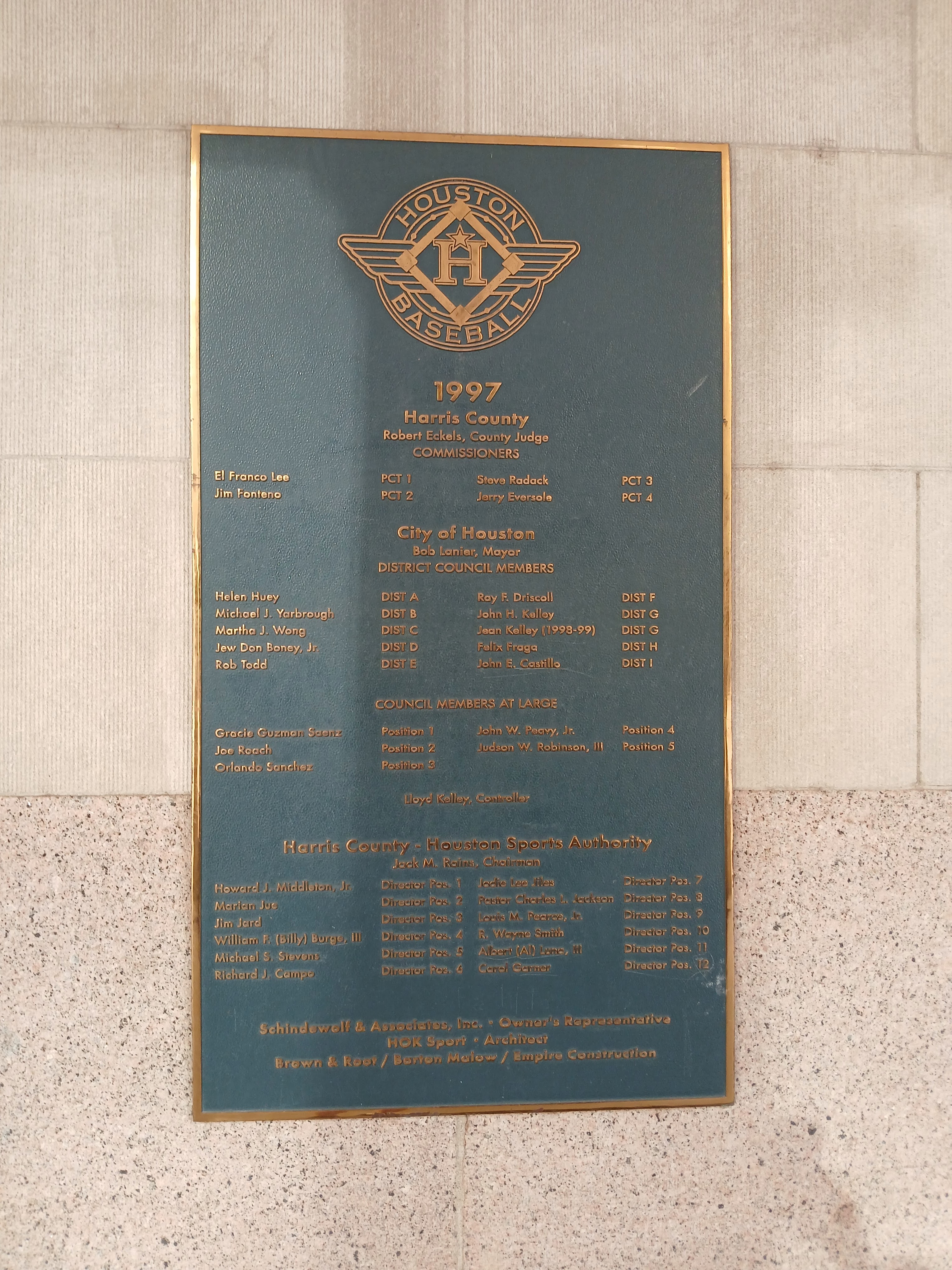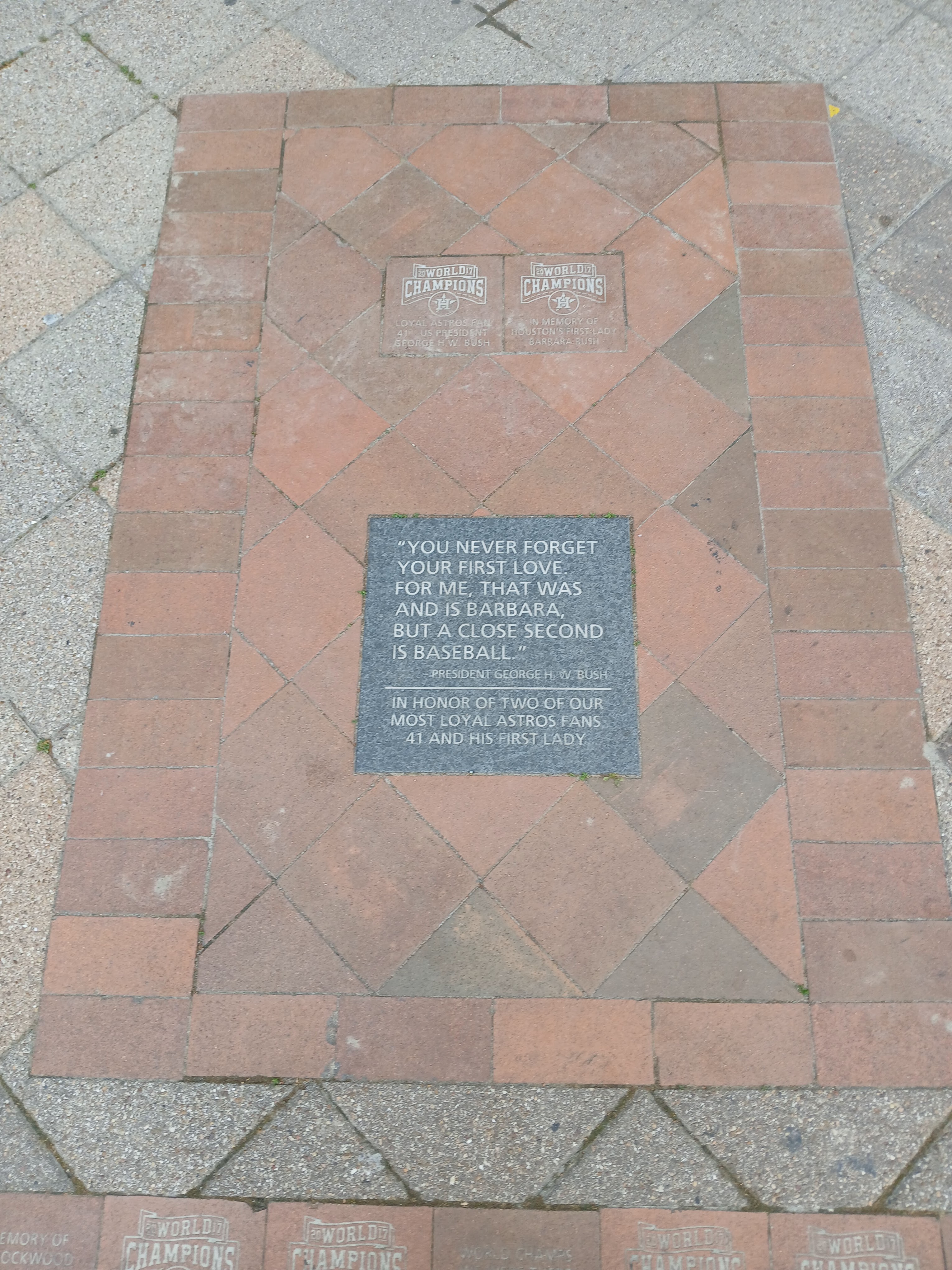 As I approached the front gate and ticket office location, I noticed a row of baseball sculptures and some Houston Astros replica World Series rings. On the bricks leading up to and away from the WS rings were names of former prominent Houston Astro players and coaches. Of course, I found my idol, Nolan Ryan, right there front and center in the bricks. Having seen his statue at Globe Life in Arlington in front of the Texas Rangers home field, I was psyched to see another Ryan tribute there in Houston. Texas baseball fans love their Nolan Ryan!!! And I just loved the quote from former President and Texas native George (HW) Bush about his first love (Barbara, his wife) and his second (baseball, he played at Yale).