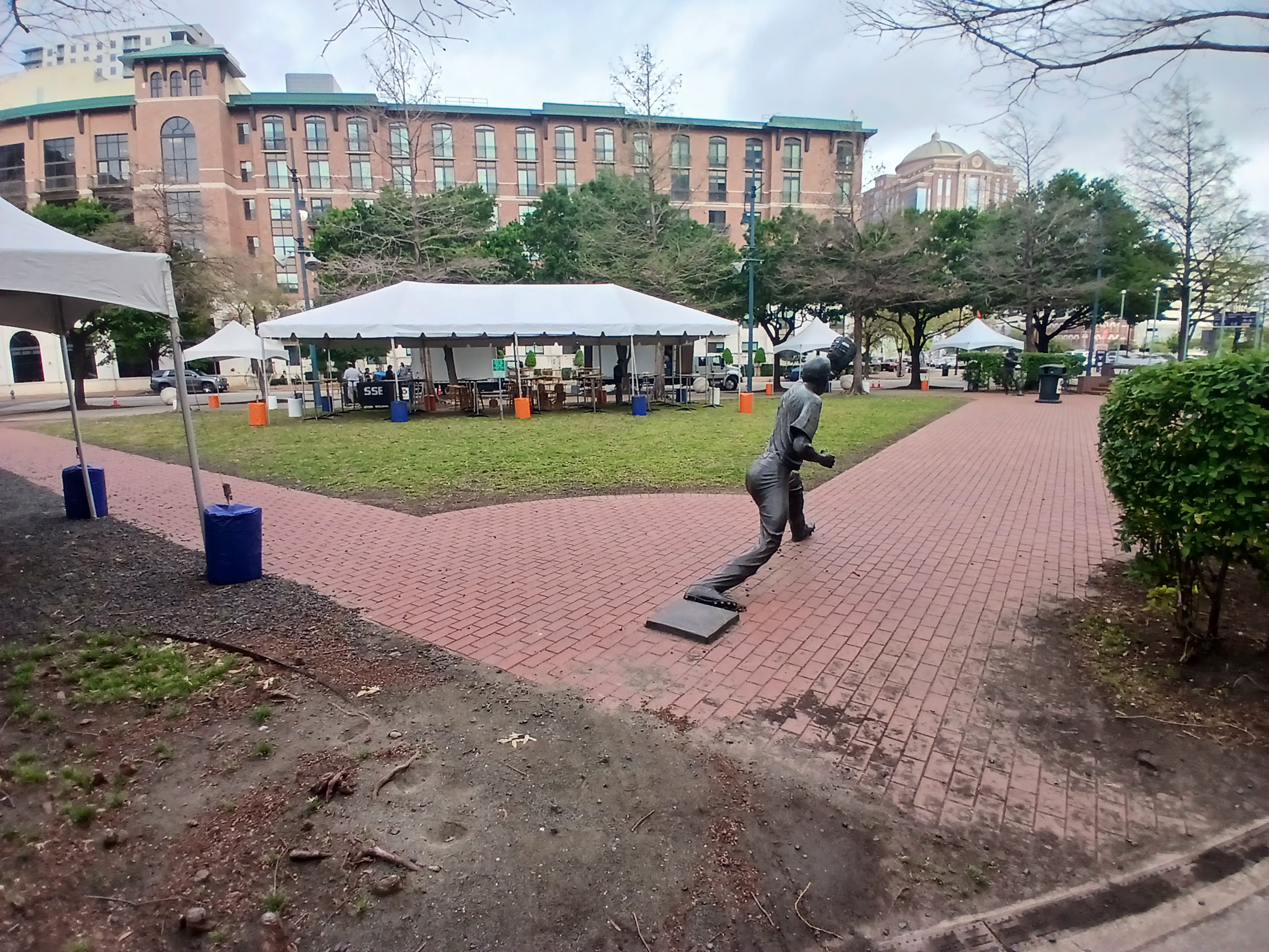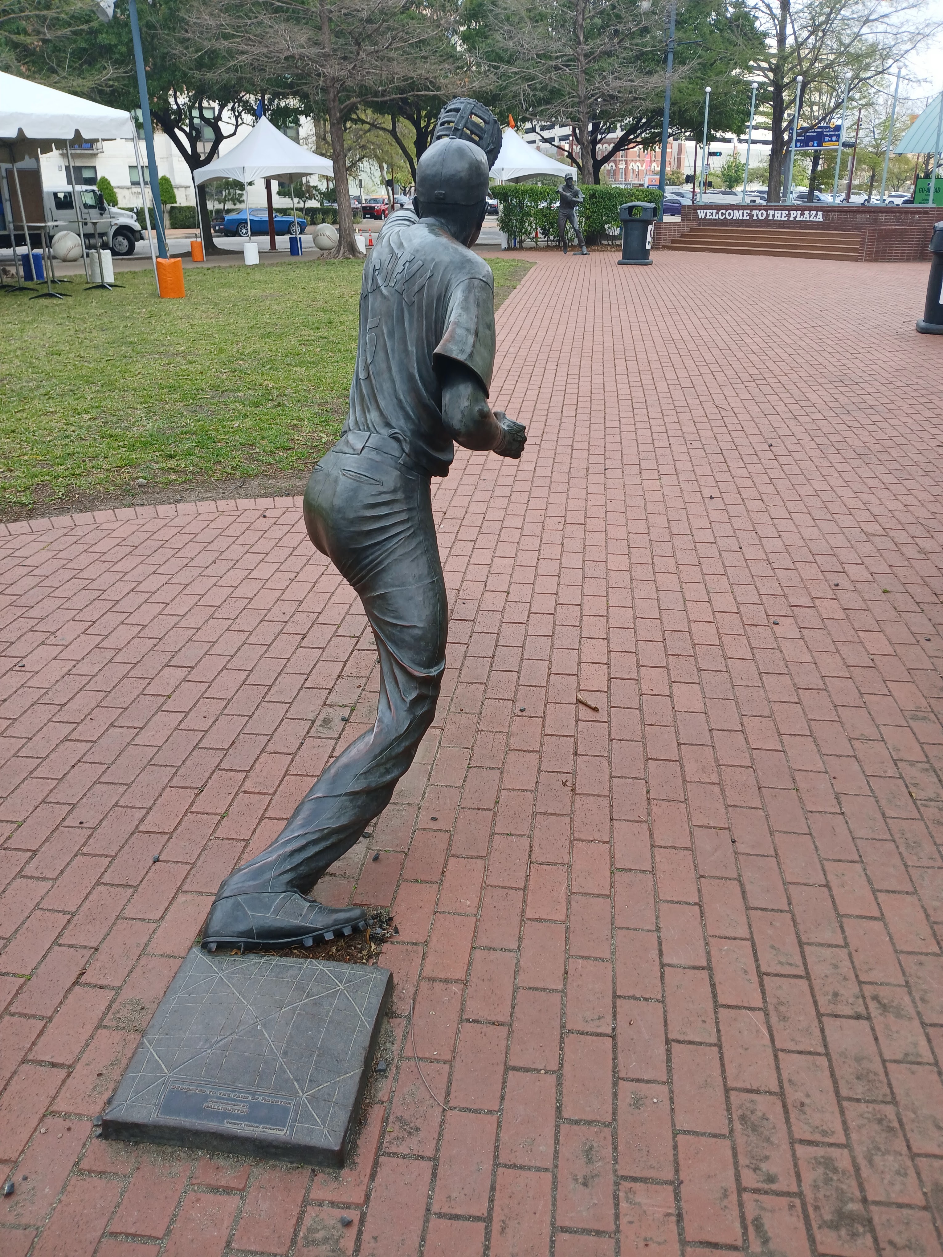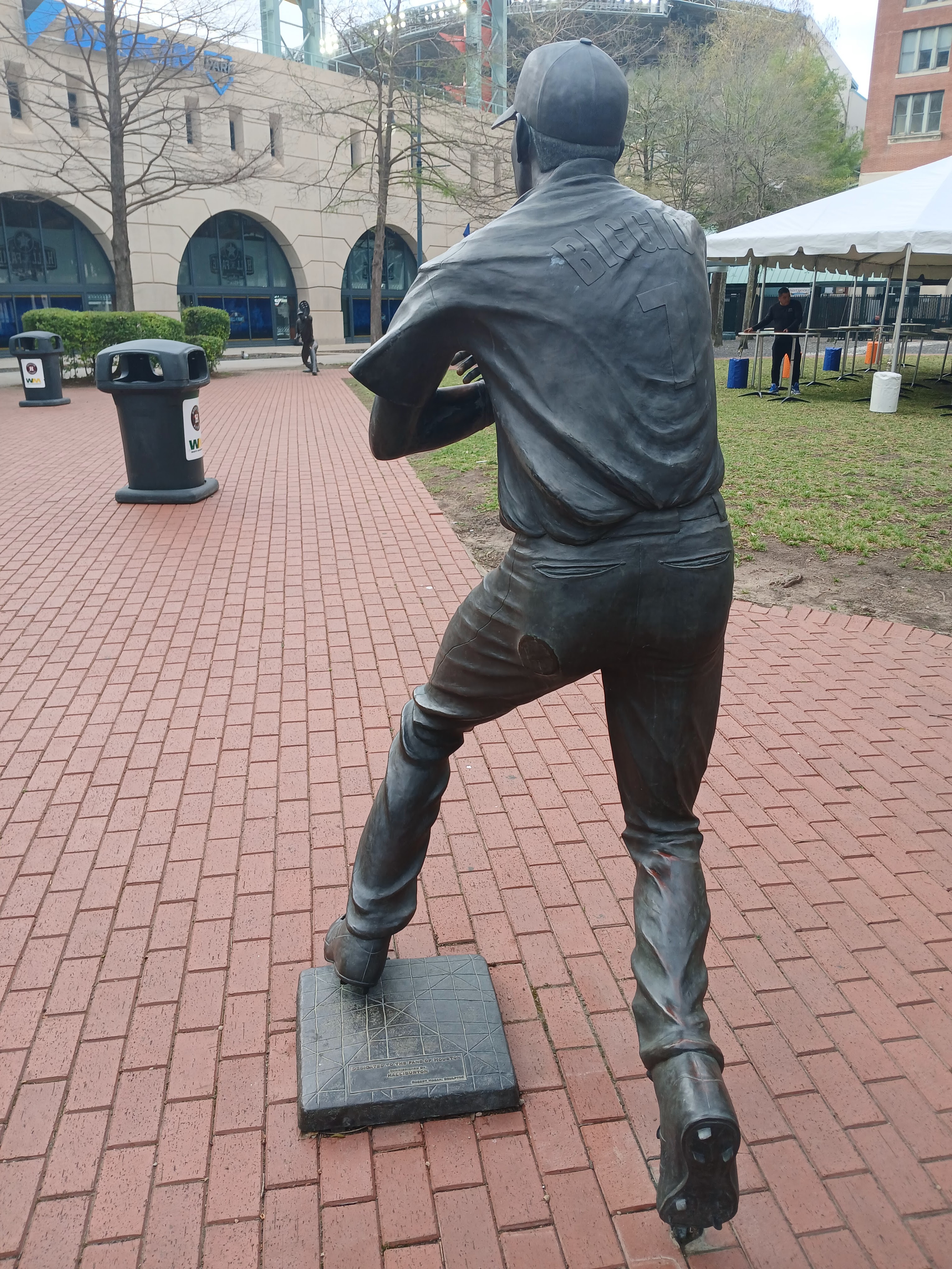 Wednesday morning at Daikin, Astros Fan Fest was getting set up. Opening Day in the Major Leagues, except for the two teams playing in the Tokyo Series (Cubs and Dodgers), was slated for last Thursday. The Houston Astros were set to open the season against the NY Mets and christen their newly named Daikin Park. Staffers were setting up tables and concert stages and fan stuff on Wednesday morning when I arrived. I chatted with a park tour guide, who told me his daughter was strongly considering Providence’s Johnson & Wales University to continue her culinary education. We chatted about RI, Newport, and I thanked him for being a great representative of the Astros. He clued me into a cool monument display featuring Astro greats Craig Biggio and Jeff Bagwell. It was one of a few displays on this back side of this gigantic baseball stadium, which I believe has a baseball field in there somewhere. Hard to believe with all that iron and steel that a pitcher’s mound, bases, and a baseball experience is on the other side of the brick walls.