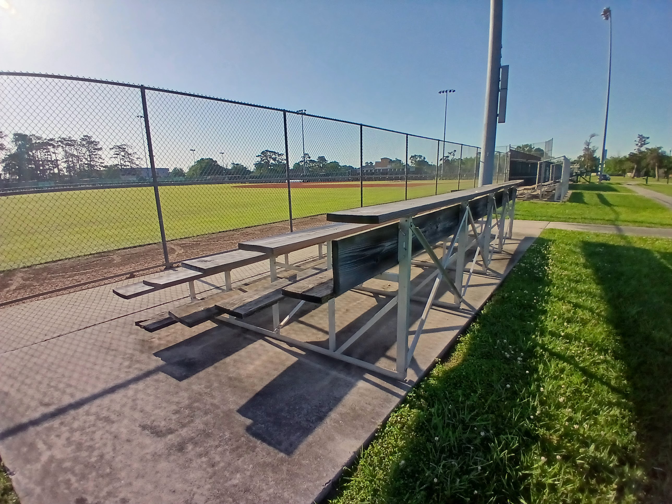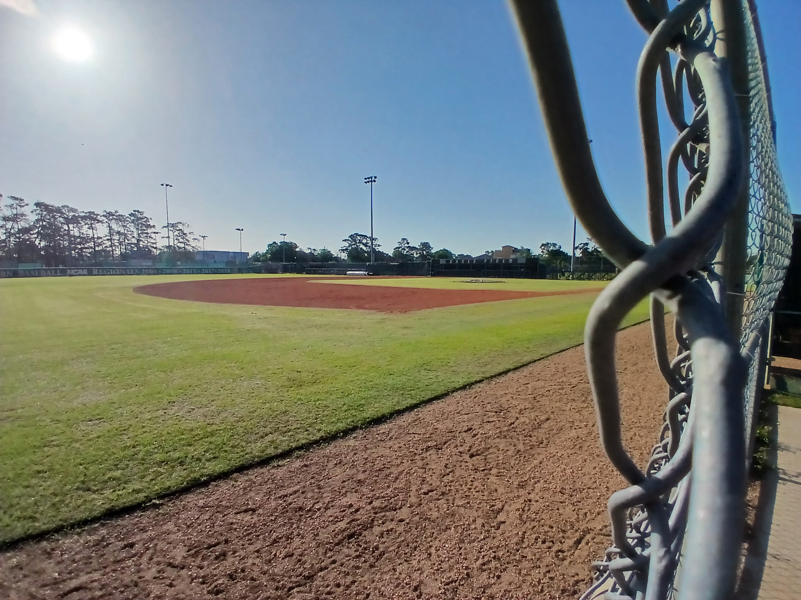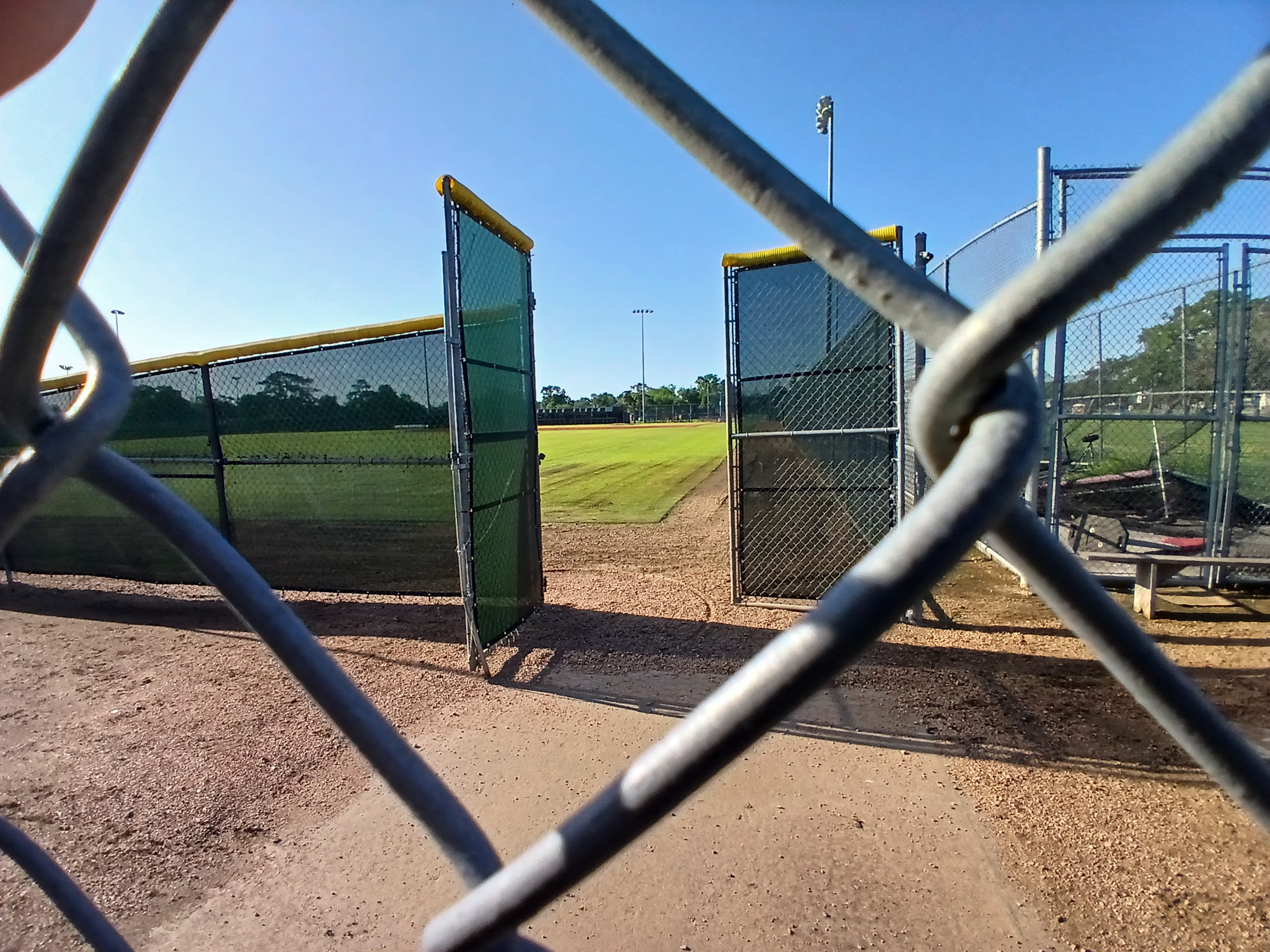 Nagle Field, as it was listed on the home dugout banner, was clearly visible from a wide range of views. With my trusty cellphone camera on ready, I walked the perimeter snapping photos. It was a beautiful, sunny day with literally zero clouds and hardly any wind. So, I made my way from the backstop area, down left field past the bullpen mounds, around the back of the field near the scoreboard, and wound up taking a sidewalk passed a community garden area into the tennis court area of MacGregor. I was trying to circle back around the field to where I park, but was unsuccessful so I finished up around the right field foul pole.