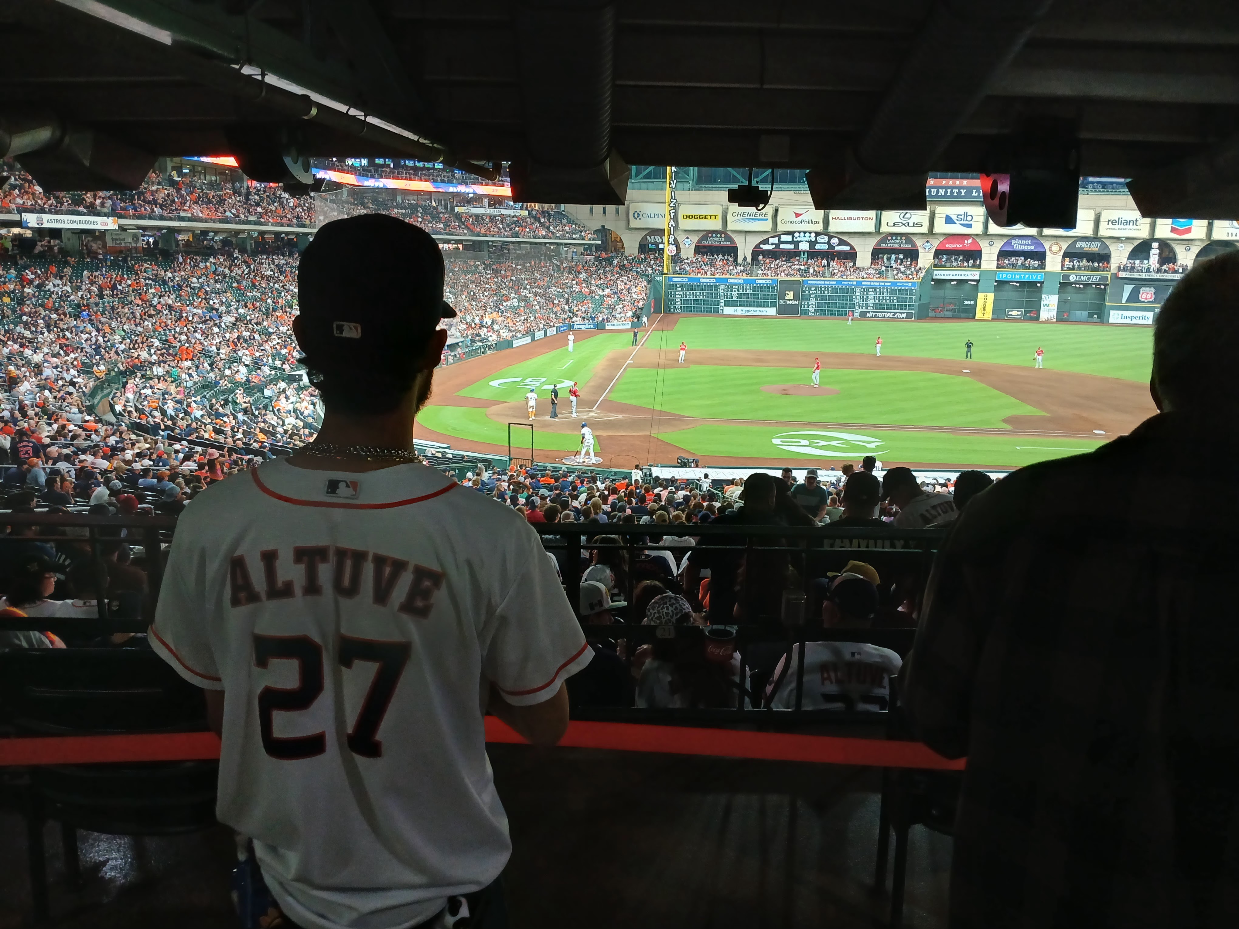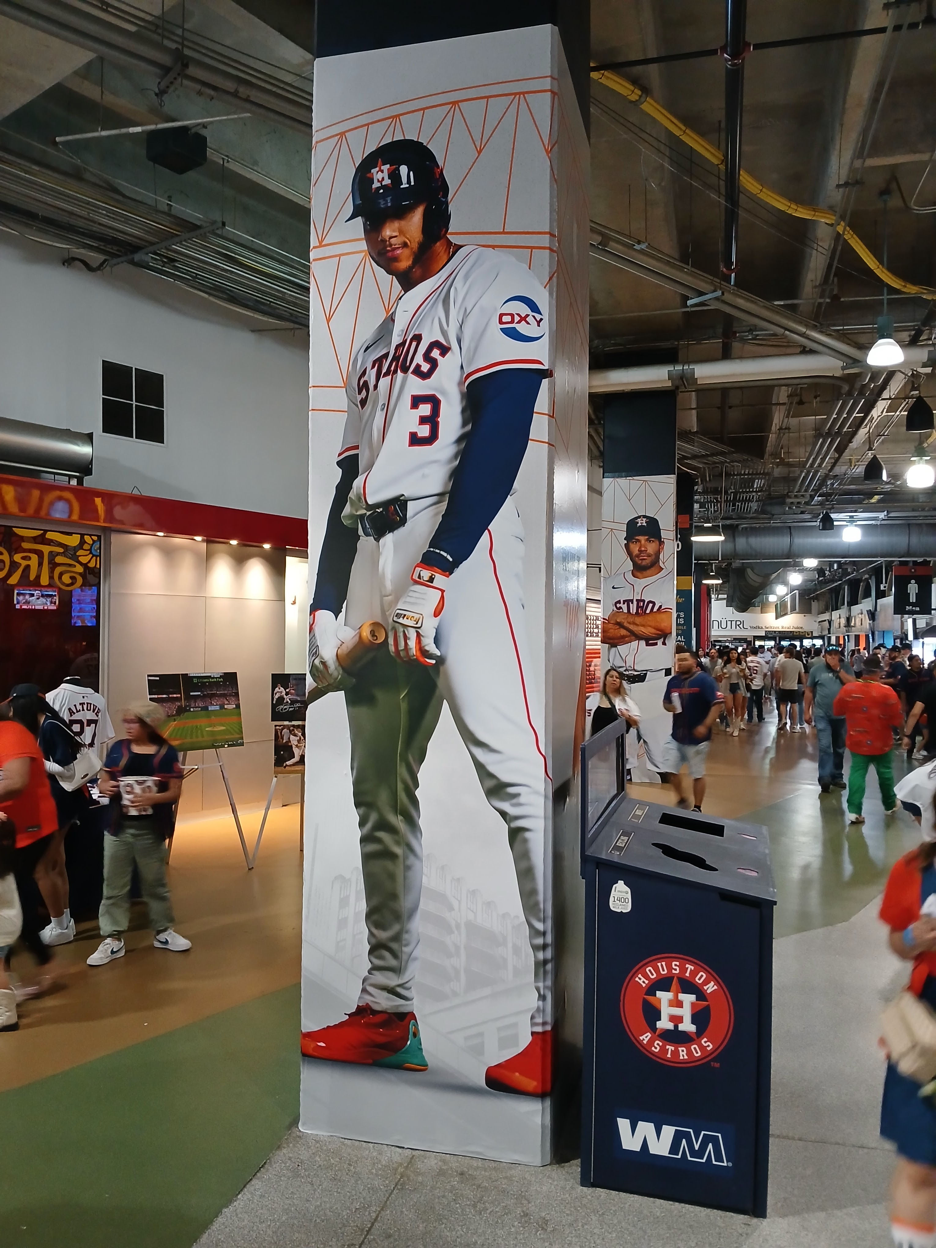 Was it a sign or just coincidence that this massive poster of Jeremy Peña greeted me as I double-timed it into Daikin Park. Whatever it was, it was so cool to see the former Classical High School Shortstop right there in his Astros Uni, #3, ready to get after it. By the time I entered the ballpark, it was about the 4th inning or so and I had missed a Peña at bat/single and a Mike Trout at bat/home run. So, I became laser focused on a photo spot to catch the next at bats from these 2 MLB superstars. And I found that spot just to the right of the backstop area leaning up against a roped area in the concession stand.