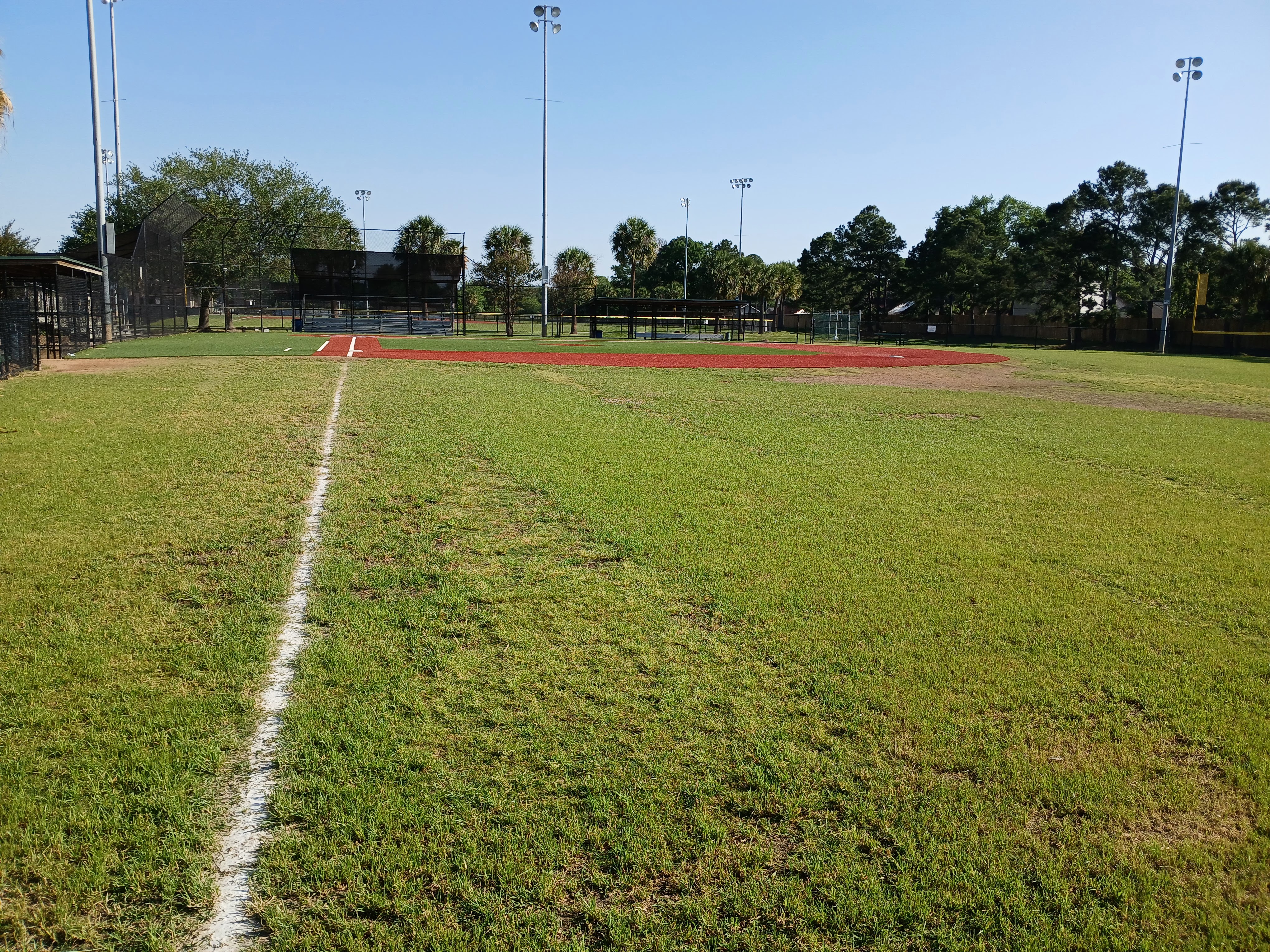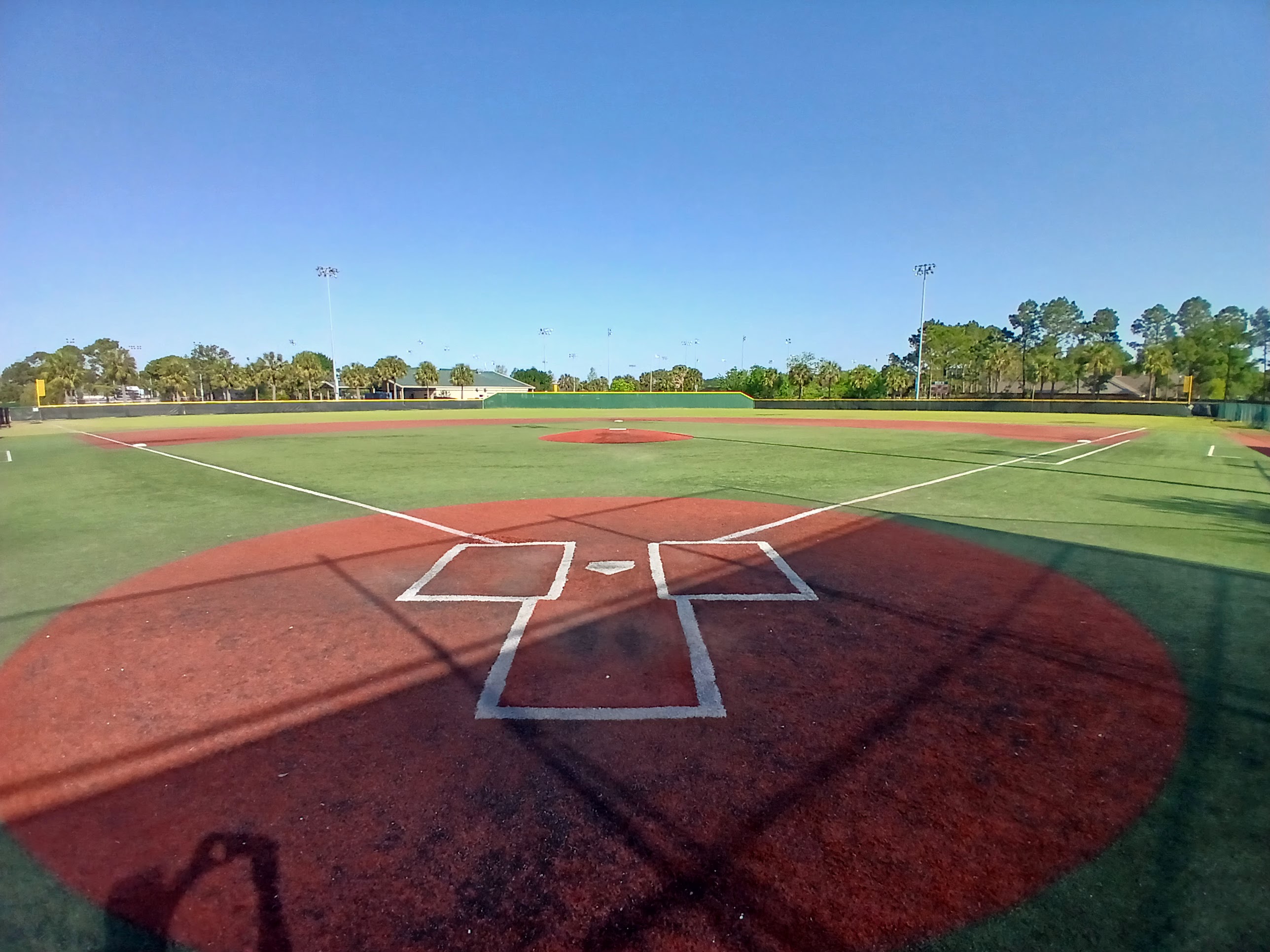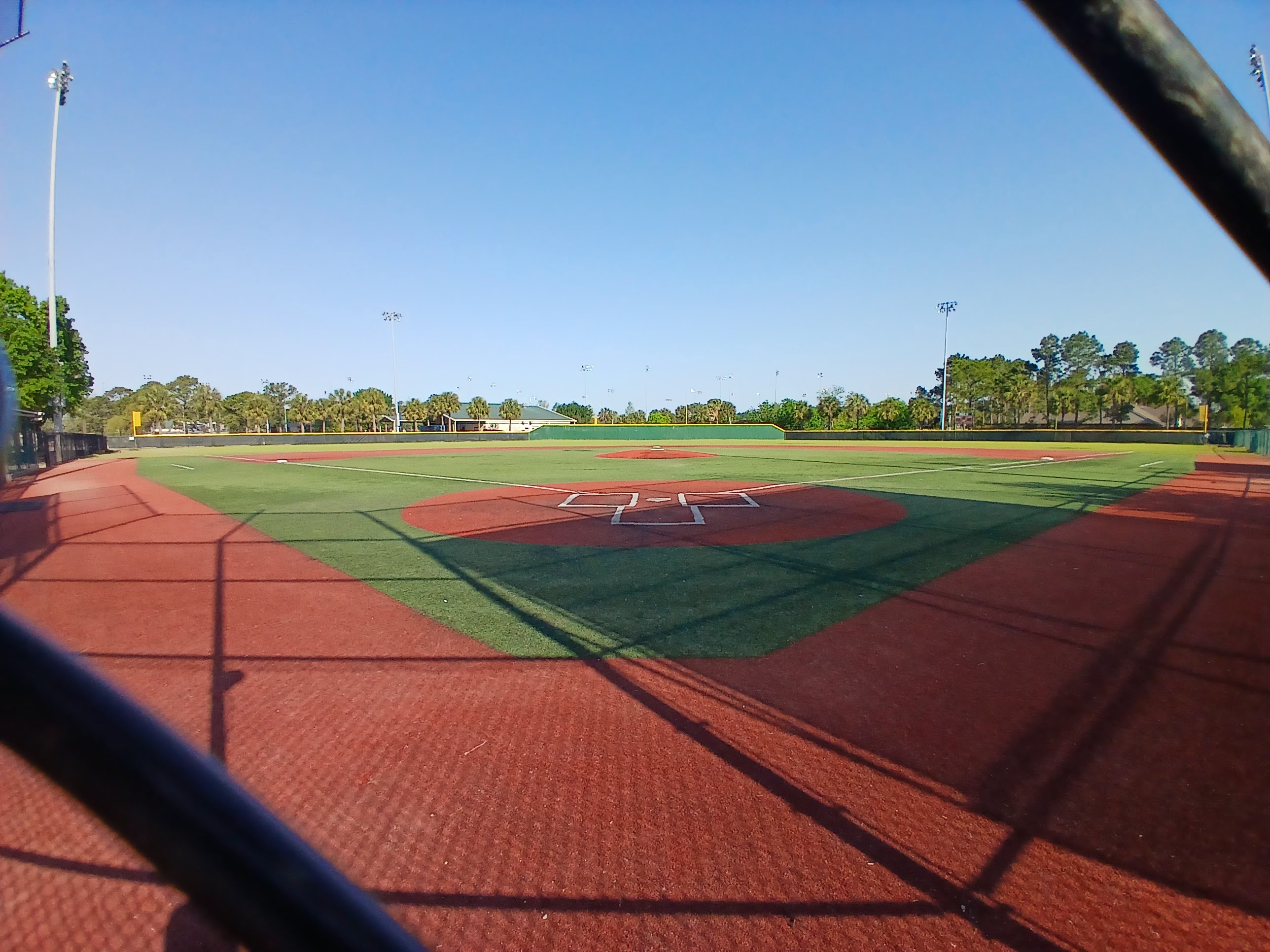 I followed the sidewalk down to the bleacher section of the first field in the complex, a gorgeous showcase type field with a huge fan seating section, covered dugouts, and a professional look. There were some concession stand workers preparing their kitchen for an upcoming tournament and I said hello and asked if I was okay to be in there. They said “no problem” which sort of meant that they didn’t know or probably didn’t care that I was there. I walked around this main field and snapped a few photos of the field and surrounding area.