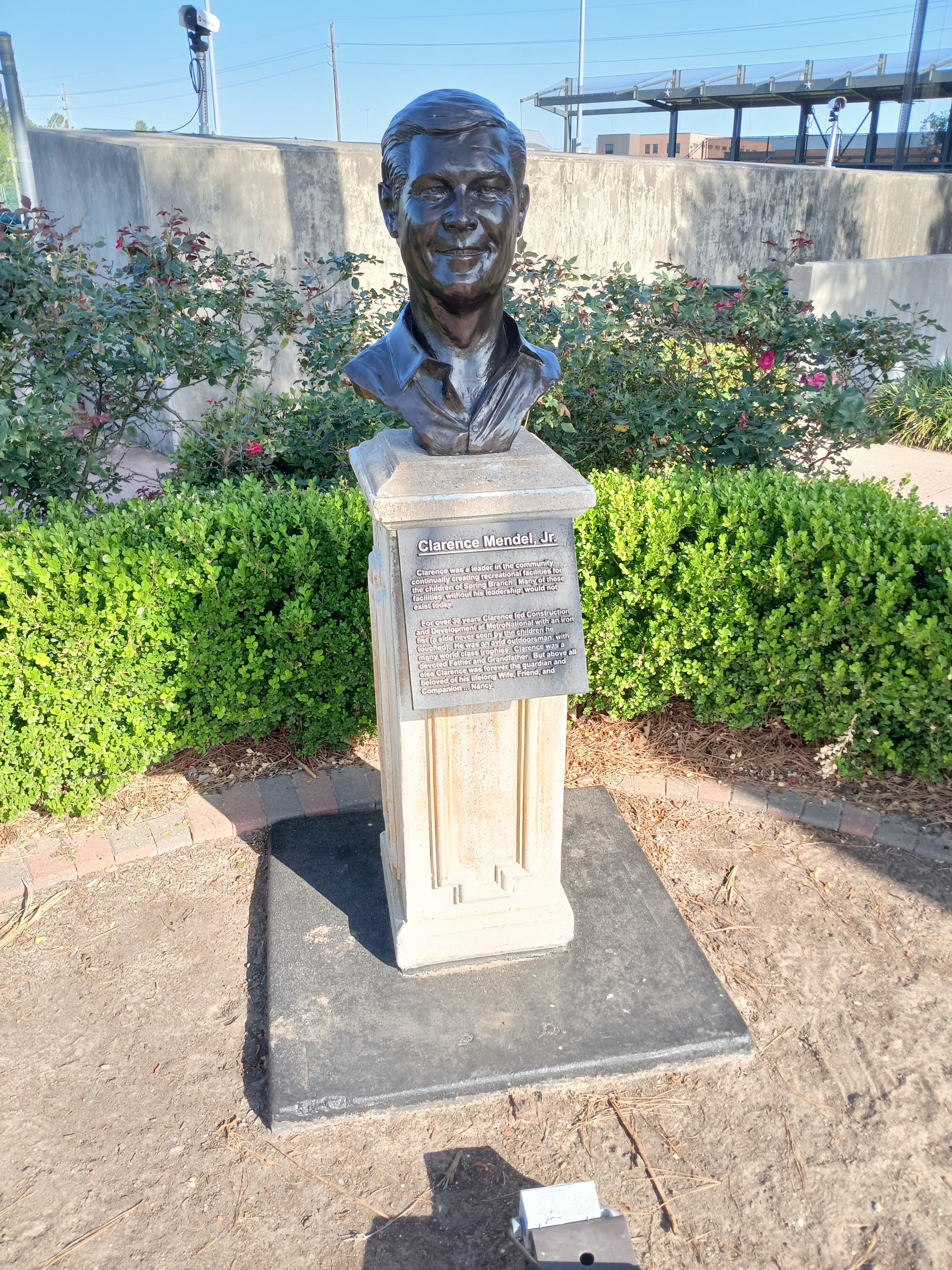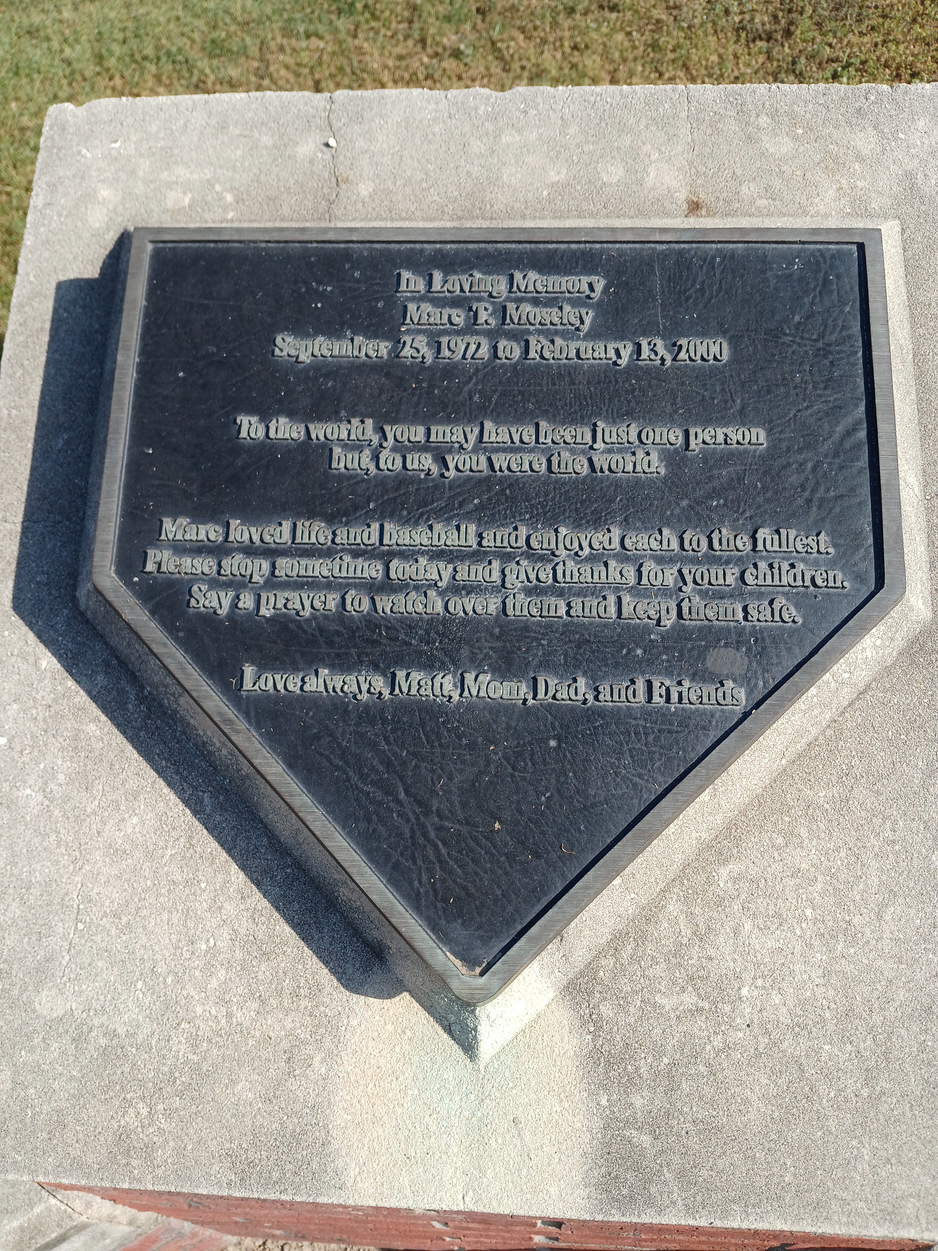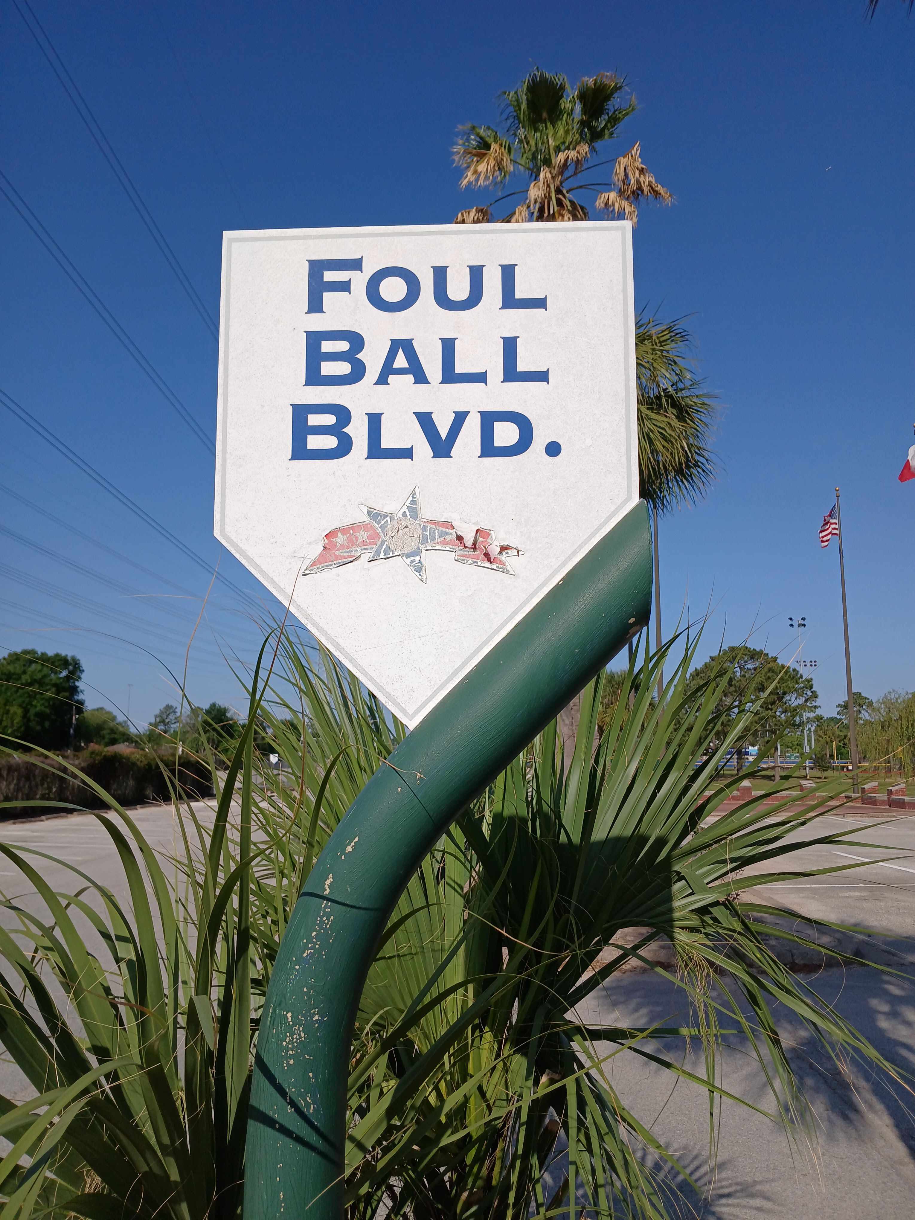 It was a beautiful weather day in Houston last Friday. Sunny skies, light or no wind, no humidity, great weather for walking around a baseball complex. As I finished up at Field 10 or 11, I began my journey back to the parking lot and my rental car. I looked up and noticed I was walking on what appeared to be “Foul Ball Blvd.” And I stopped to check out this memorial which was surrounded by tall Texas and American flags waving in the Houston wind.