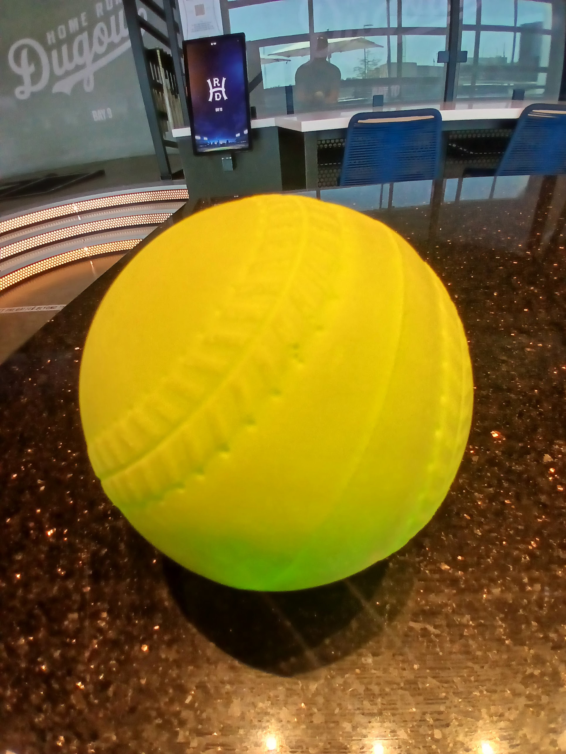 So, what kind of baseball do you hit? Good question, I snapped a photo of this one to show you. It is a foam baseball about the size of a smaller softball. It is bright yellow, so you can’t miss it, no pun intended. The foam consistency helps reduce damage on the screen, the bays, etc. etc. so once again, Home Run Dugout has thought of everything.