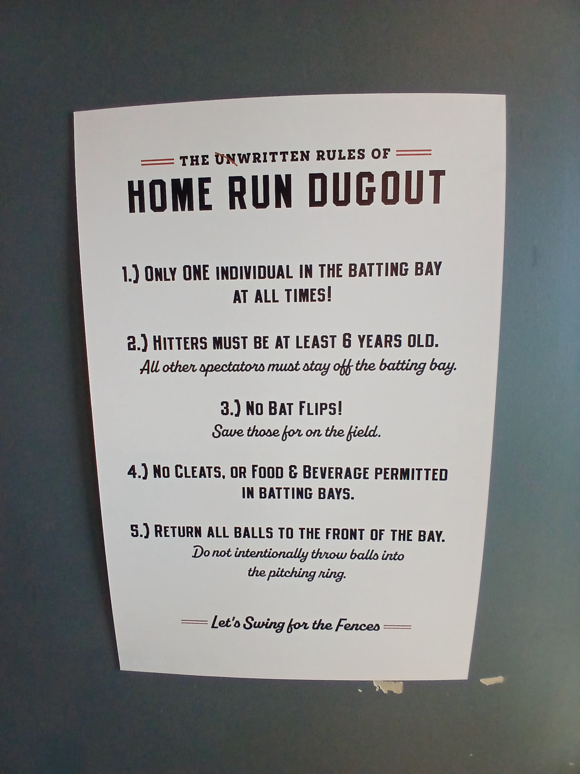 What about rules inside the facility? Check out “The Unwritten Rules of Home Run Dugout” that I found inside the large baseball bay section. One at a time, no bat flips, no cleats in the bays, swing for the fences – all seems pretty reasonable!