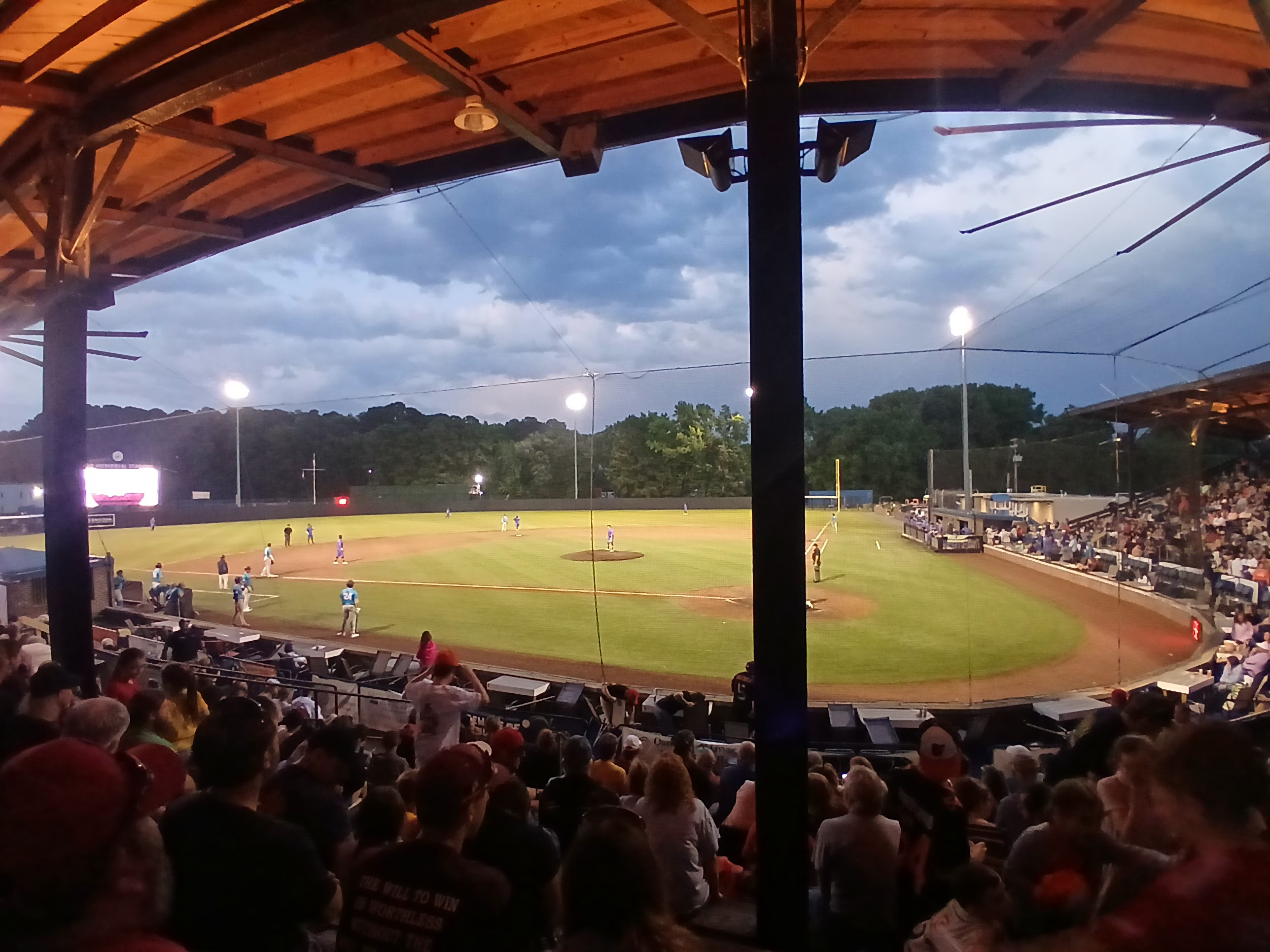 This fan (and Rachel) got to watch part of the Peninsula Pilots vs. Morehead City Marlins game at historic War Memorial Stadium, Hampton, VA last night. By the looks of the cars in the parking lot, on Pembroke Ave, and around the stadium, I wasn’t quite 100% sure I was going to get in. War Memorial Stadium was jam packed with fans. Great opening ceremony with kids singing the national anthem, so adorable. I think the Marlins were doomed from the start. Pilots take control of the game early and didn’t let go (fishing reference), winning a rain soaked, rain delayed contest 5-1.