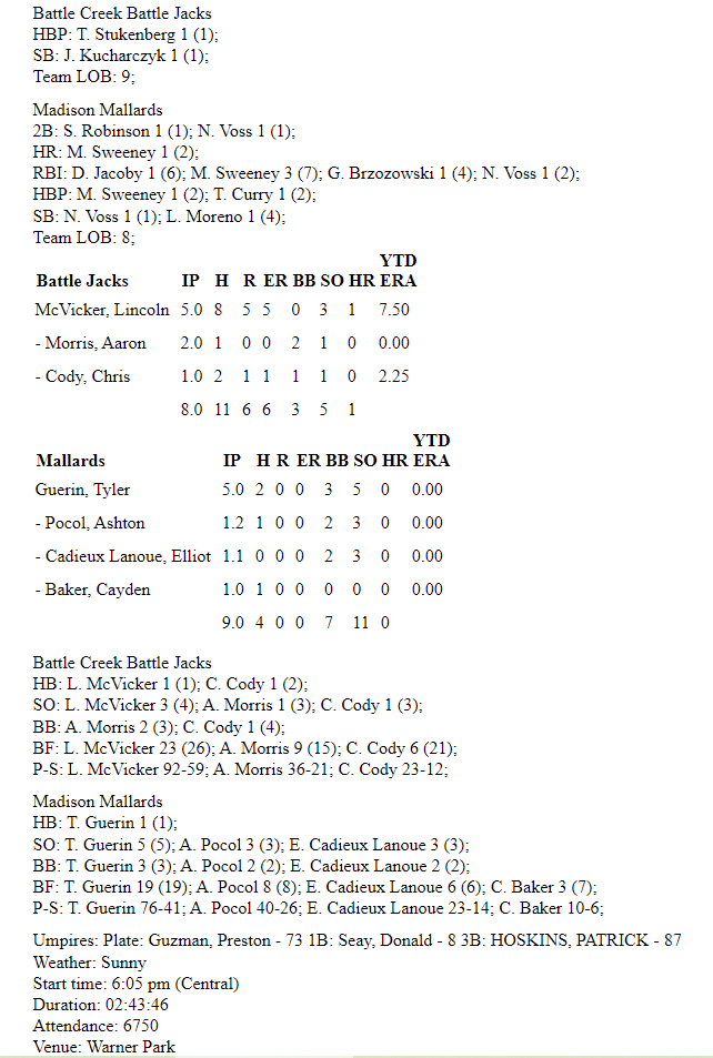 The Madison Mallards continue to pack them in at historic Warner Park, aka The Duck Pond, and continue their winning ways. The Mallards blanked the Battle Creek Battle Jacks last night 6-0 in front of 6,750 fans. Wow, what an experience for those players and their families.
