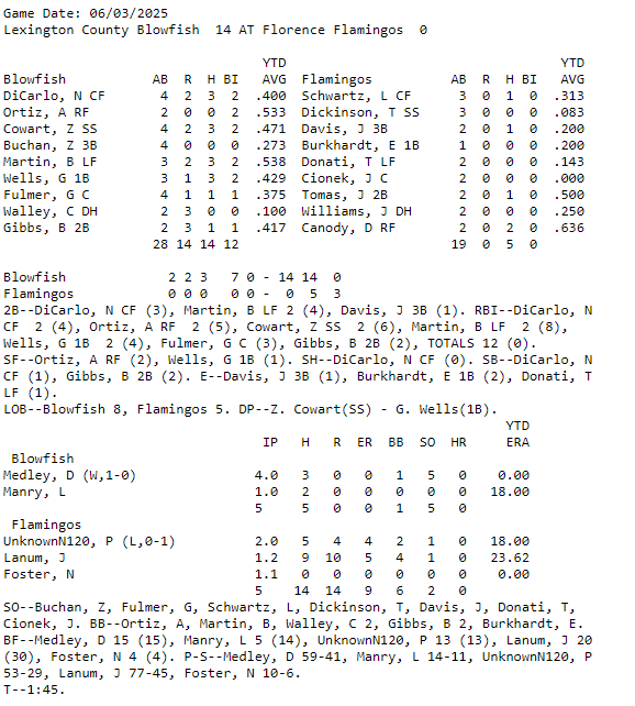 Speaking of Pilots, no Peninsula Pilots action last night in the Coastal Plain League, but no worries. Plenty of CPL action happening all over the map. Here is a recap snapshot from the Coastal Plain League IG page. And the box score from the Lexington County Blowfish vs. Florence Flamingos game. Wow, what is in the drinking water in Lexington County? Two games in a row with huge offensive numbers for the Blowfish. Wowza!!!