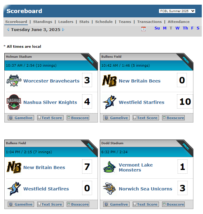 Futures Collegiate League had 4 games on the docket for Tuesday, June 3 including some early morning contests. I approve, get the day started with a baseball game and then you have the rest of the afternoon to recover! I like it. Here are the scores and box scores from yesterday’s Futures League games: