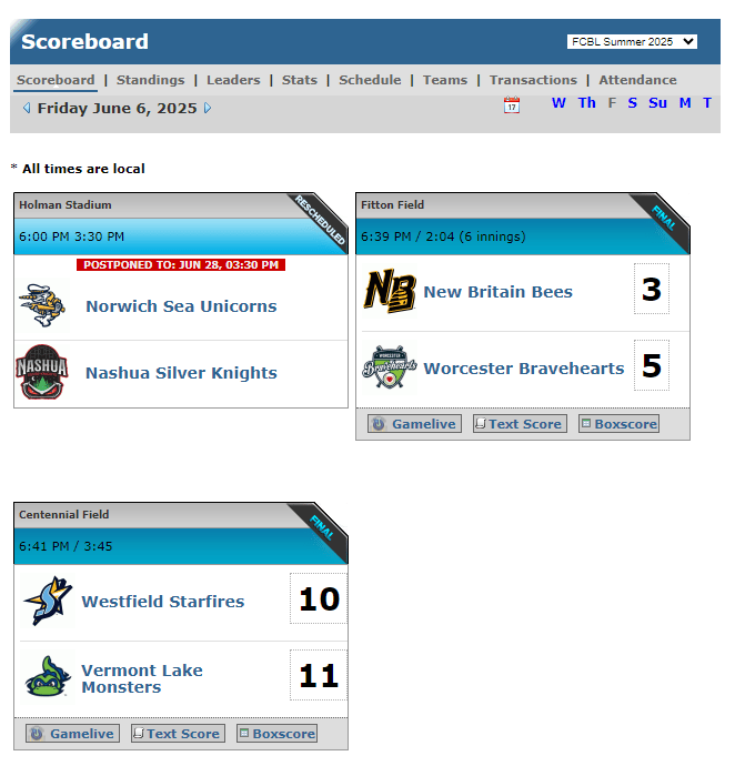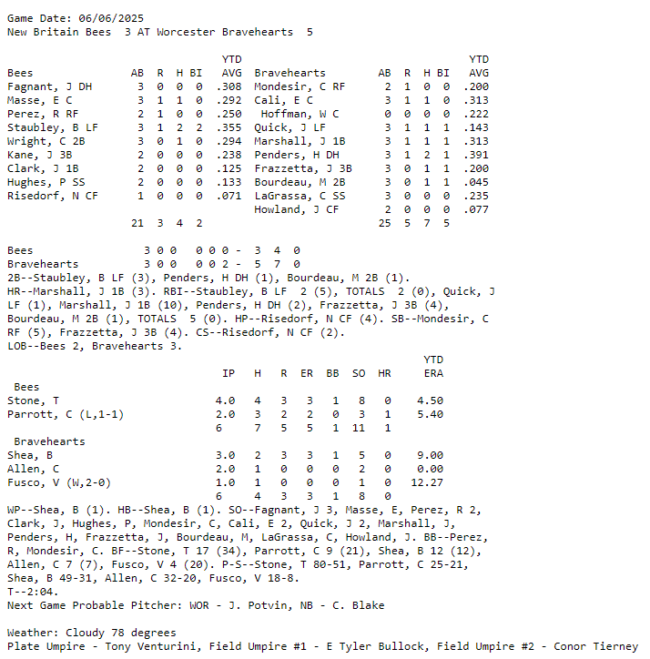 Two games played in the Futures Collegiate League last night, June 6th. Worcester over New Britain 5-3 and Vermont overtaking Westfield 11-10. Box scores below: