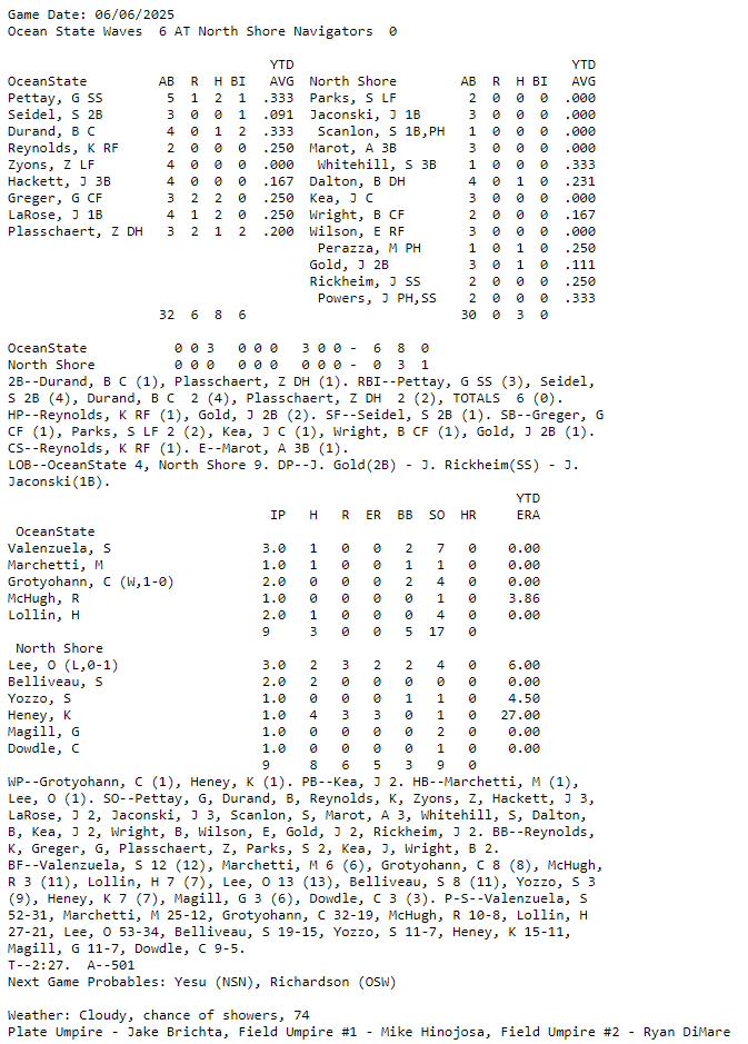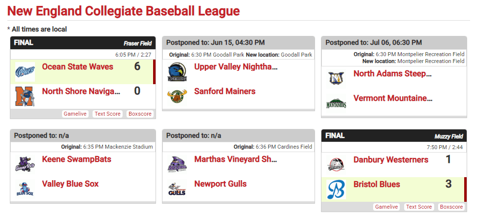 Just two out of a possible 6 games last night in the highly competitive New England Collegiate Baseball League. Waves vs Navigators and Westerners vs Blues found enough space in the bad weather of New England to get their games in. By the way, Bristol Blues’ Muzzy Field is an amazing, throw back baseball park. A must see field for the baseball enthusiast.