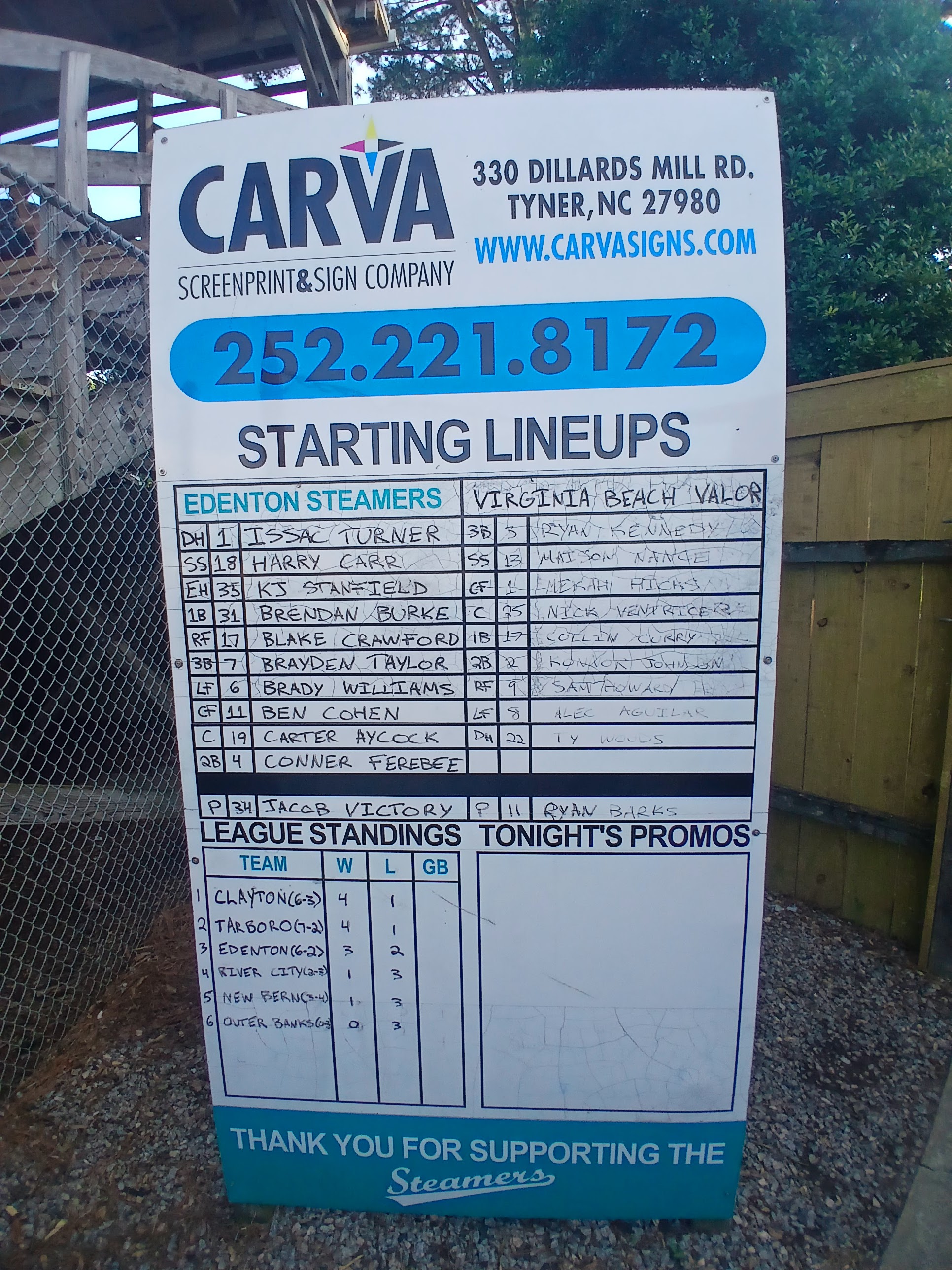 For last night’s game, the Edenton Steamers played under their alternate team ID, the Rocky Hock Gnats. The Steamers/Gnats play in the Old North State League, which has 4 divisions, each with 6 teams. The Steamers/Gnats play in the Tidewater Division. Steamers mascots were still in attendance greeting fans and playing games in between innings with the fans on the field. The Gnats took on the Virginia Beach Valor, a Tidewater Summer League team based not too far from where Rachel and I live in VA Beach. We went to a VB Valor game last summer, so we were familiar with the organization. Last night’s game was one of many interleague type games both the Valor and Steamers have on their 2025 Summer Schedules.