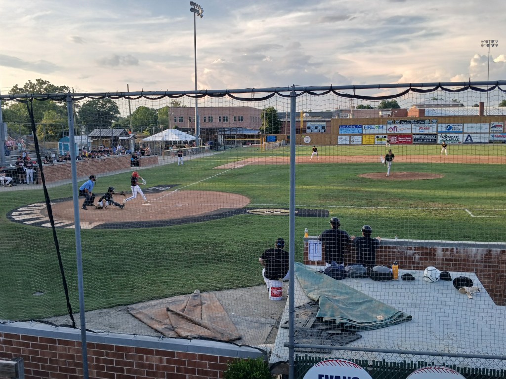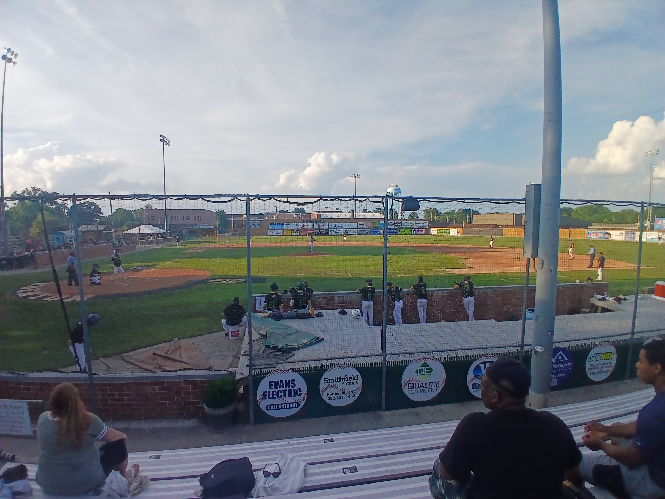 By the time the national anthem was sung, “play ball” was announced, and the first pitch was thrown, Hicks Field had filled up nicely with energetic fans. There was a really nice mix of older fans (like myself), families, and kids at the park. Seating was no problem as Rachel and I found great seats in the bleachers behind the visiting VB Valor dugout. With Rachel’s foot still in a boot, we took extra caution going up the wooden bleacher steps and parked in one spot for the game. I was happy to play waiter for our dinner plans, heading over after the 2nd inning to grab some burgers and hot dogs, what else do you eat at summer baseball league game. Behind the food stand, you could see a grill and hear the chatter of the men and women cooking the food. Community, thy name is Edenton!
