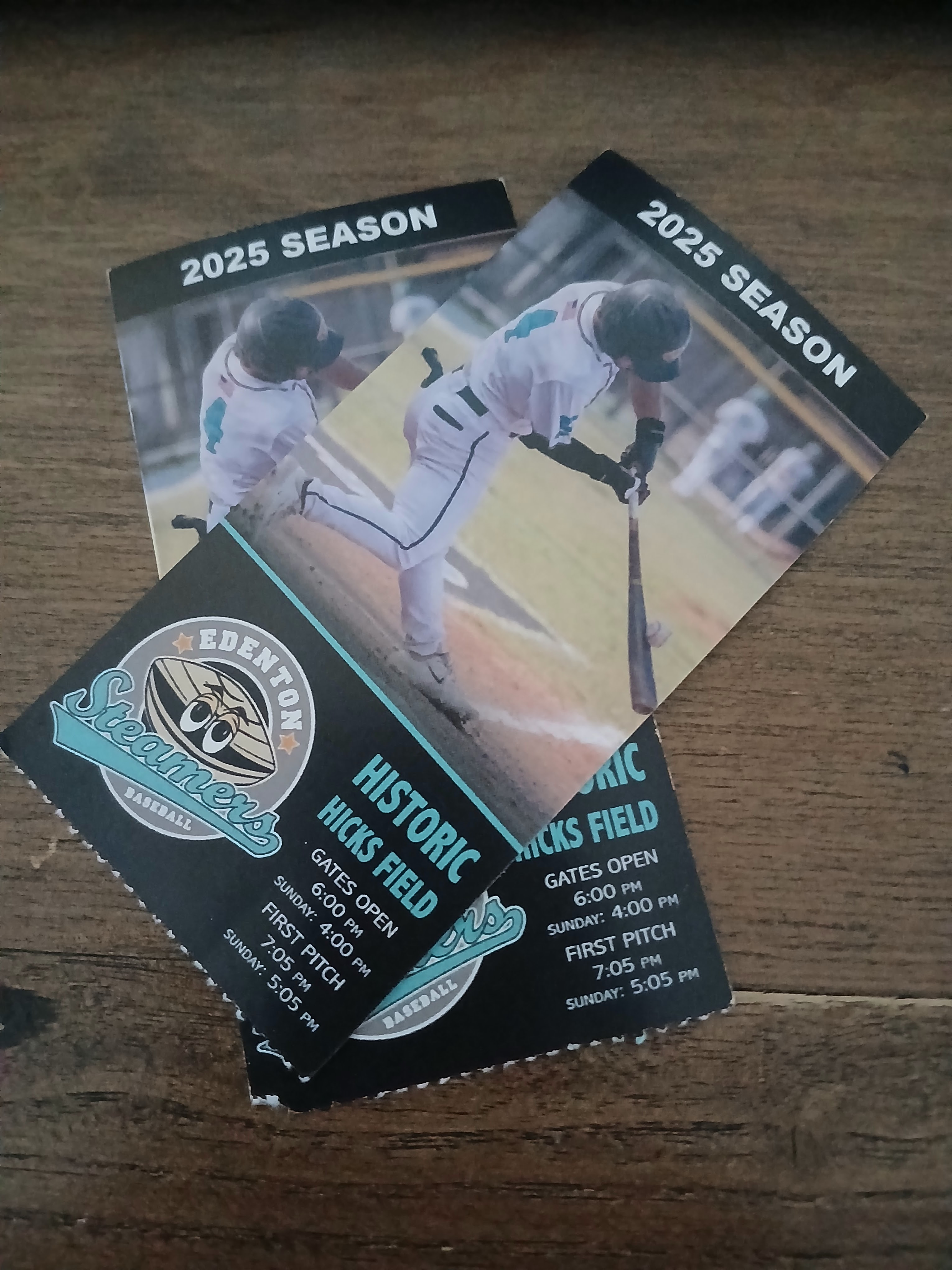 We pulled into Hicks Field and found parking (free of charge) in the parking lot behind the stadium, sort of on the third base side. Kids got free tickets to the game last night as a promotion, so there was a man in the parking lot handing them out as he saw them. Rachel and I walked up to a traditional ticket office and got two printed tickets, handed them to an attendant who ripped the bottom portions off, then handed back the remaining ticket for our entry into Hicks. Baseball as it should be – a tangible ticket, a greeter to welcome you to the park, and a tangible piece of paper for your souvenir or office to reference one day. The only modern convenience in the entire transaction was I paid with my credit card. If I had cash or coins to pay, it would have been baseball bliss!! Maybe next time in Edenton.