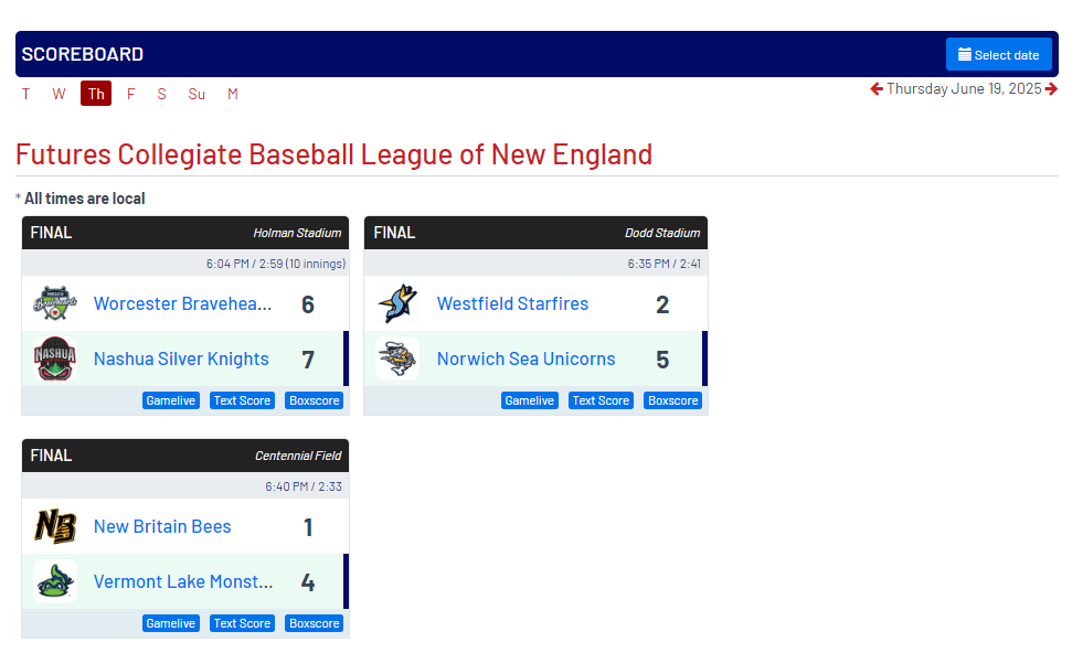 And here are your standings in the Futures League after just under 20 games into the 2025 season. Looks like Worcester and Vermont are setting the pace with 12 wins each. Still plenty of baseball to be played this summer, so make sure you head out and catch a Futures League game near you.