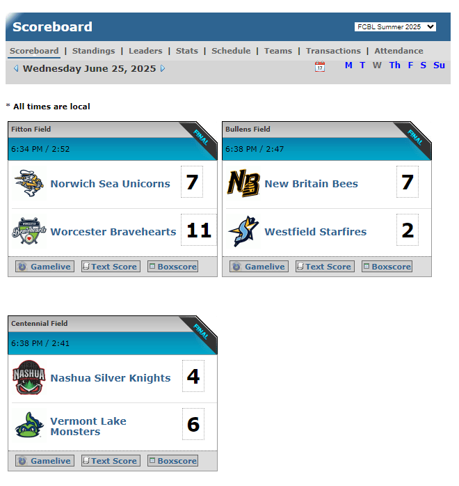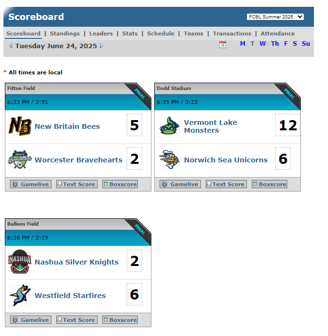 According to my son up in Rhode Island, the temperatures in New England are record setting hot, hot, hot. Futures Collegiate League action from Tuesday and Wednesday below. Vermont Lake Monsters and New Britain Bees both braving the heat and winning both nights.