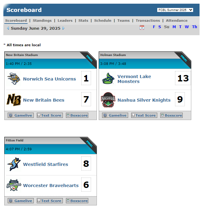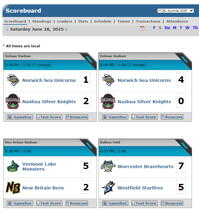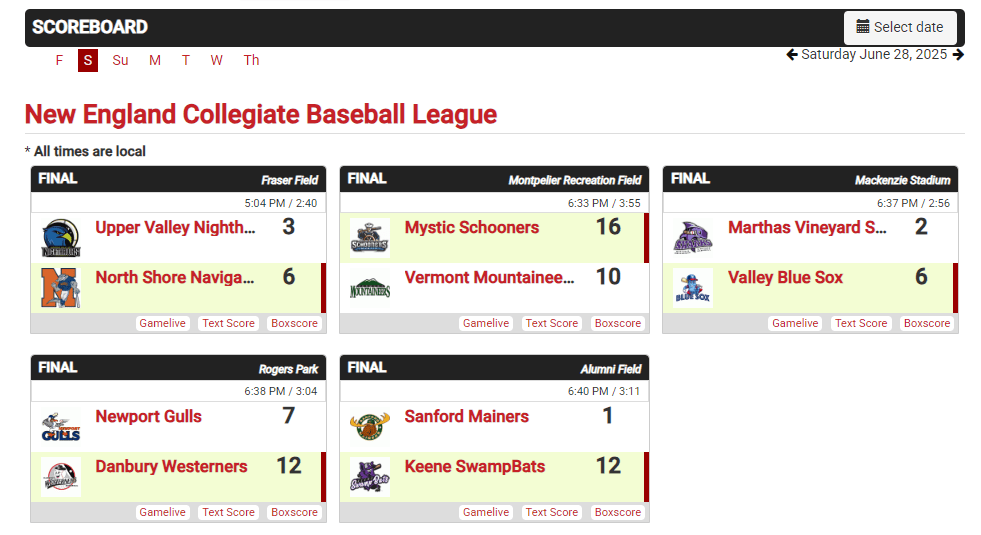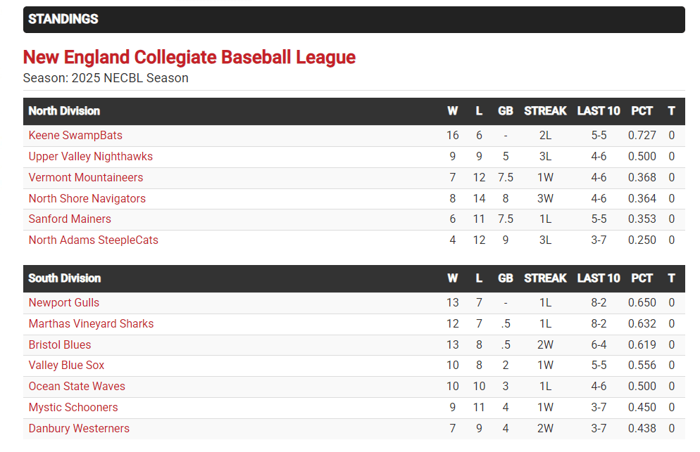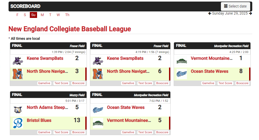 One more trip up north to the New England Collegiate Baseball League for Saturday and Sunday scores. And the standings as of this morning, June 30th. Keene SwampBats lead the North, Newport Gulls lead the South.