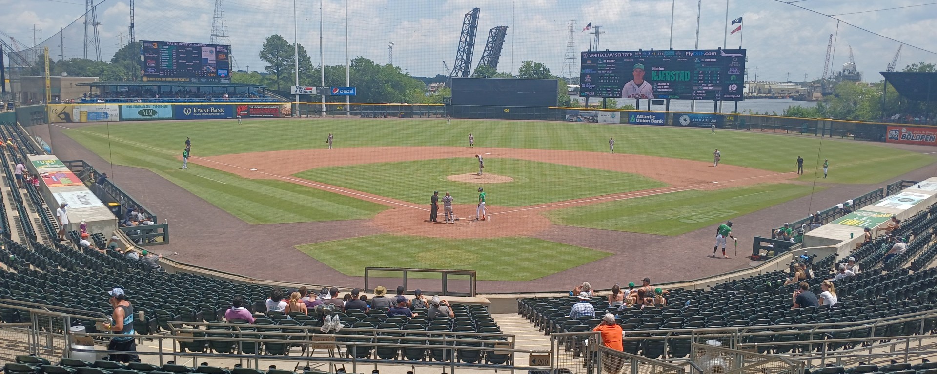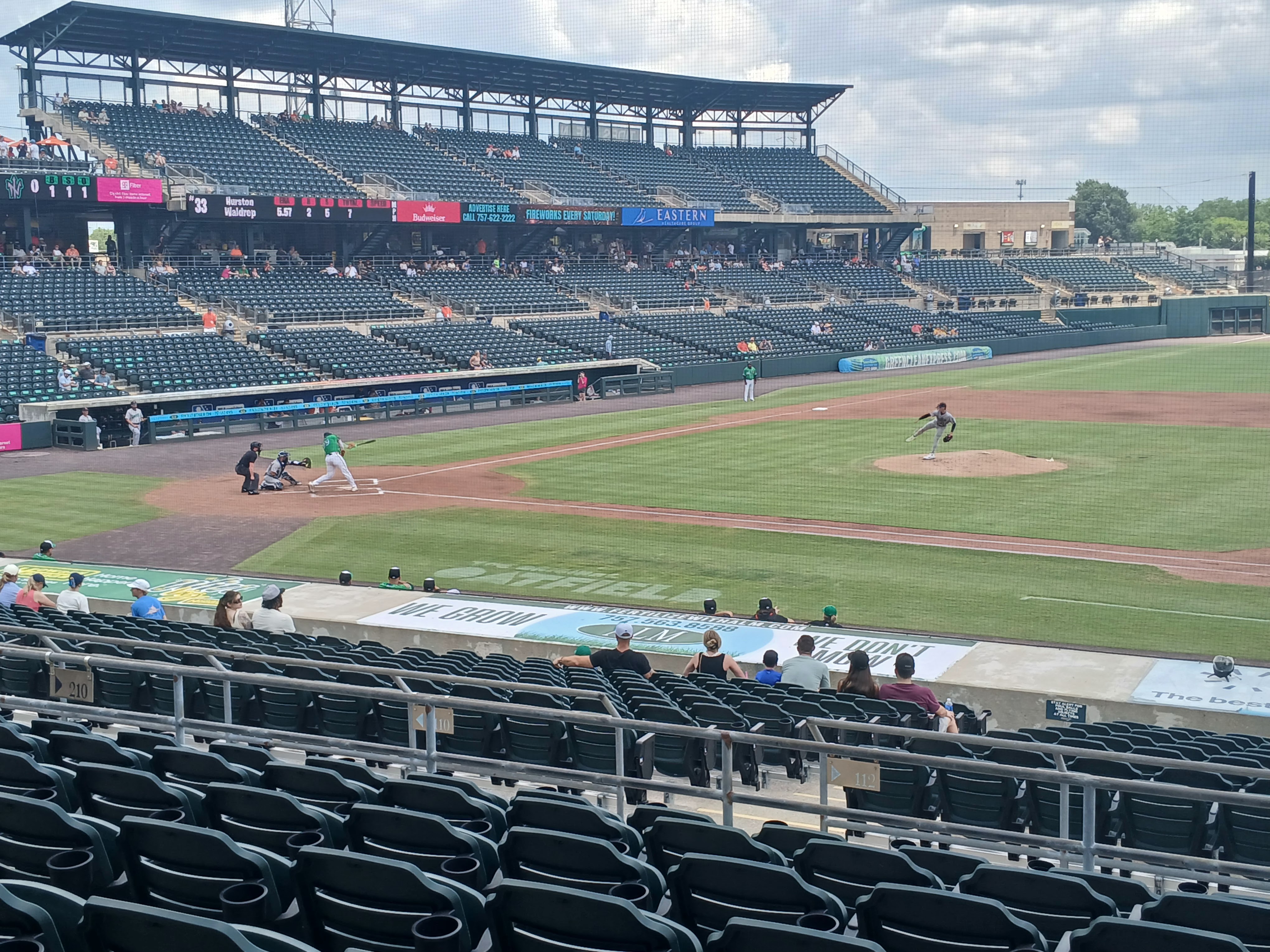 Growing up in New England, a heat wave was classified as several consecutive days over 90 degrees in temperature. Now living in Hampton Roads, they call it – June. And it is not just consecutive days, this is almost the average temperature here in Southeastern Virginia for about the next 3 months. Heat wave, June, whatever you want to call it, it is hot and humid and darn near tropical conditions daily. So, you adapt and find ways to stay cool and find activities where there is air conditioning or shade. Like…Harbor Park, home of the Norfolk Tides, who just happened to be playing this past Sunday afternoon.