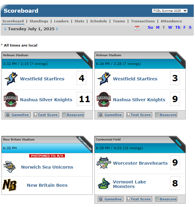 Here are some game scores from yesterday’s Futures Collegiate League games. I am psyched that they got the games in because, according to my son, it was raining and stormy yesterday night. Not surprised the New Britain Bees (CT) got postponed, there was a T-storm warning for CT, MA, and RI yesterday afternoon.