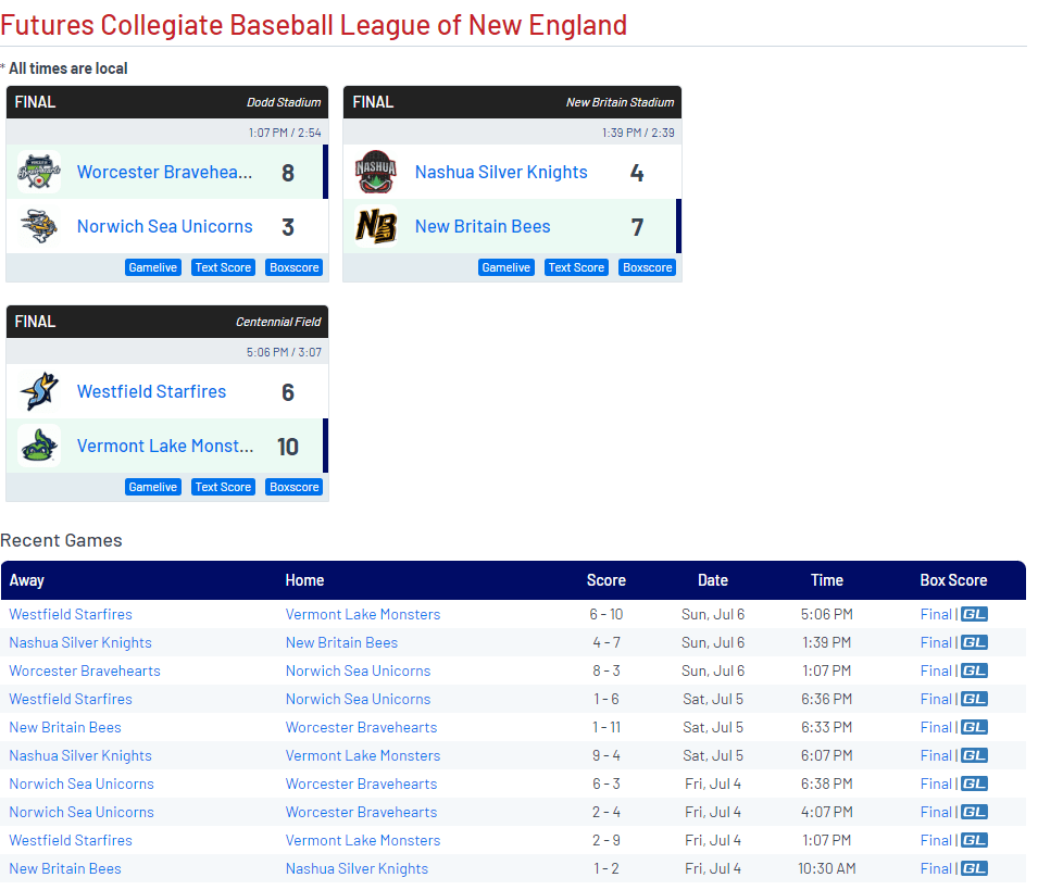 Here are some scores from July 4th through July 6th in the Futures Collegiate League. Real battle at the top of the FCL, with Vermont and Worcester trending in the top 2 spots of the league. A lot of baseball left in the FCL this summer, so check out their website for games, schedules, and more.
