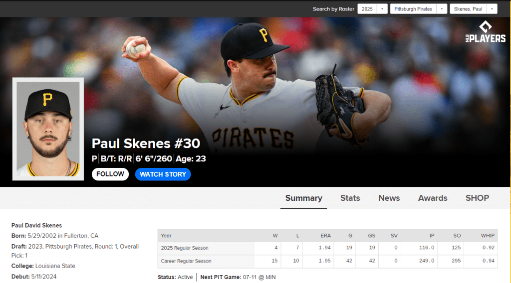 Nolan Ryan, Greg Maddux were must see TV for me. Ryan, I saw less of growing up in the 70s and 80s where a national game was once a week, and you were lucky if Ryan was in that national game. I saw Maddux a lot in his hey days on TNT and TBS when he pitched for the Atlanta Braves. I wasn’t a Braves fan, I was a Maddux fan. And now with the Pittsburgh Pirates via MLB.TV, I am laser focused every 5th day or so in the rotation to watch the great Paul Skenes, who is this generation’s must watch Pitcher. Skenes dominates, baffles, and overpowers professional Major League Baseball hitters every single time he steps on the mound for the Pirates. Batters walk away shaking their heads, slamming their bats down on the ground, and wondering what the heck did Skenes just throw and what else is he capable of throwing. 42 games isn’t a huge sample, I know. But wow, is Paul Skenes off to a tremendous Major League Baseball start!